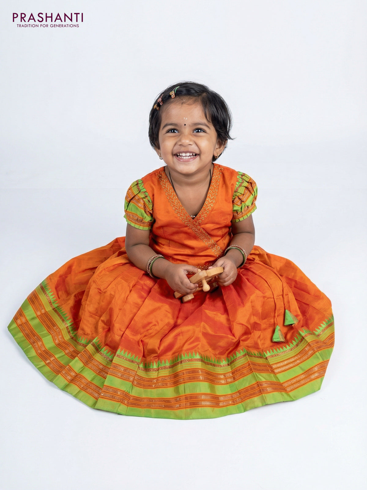 Silk kids lehenga orange with aari work neck pattern and temple design zari woven border for 1-2 years