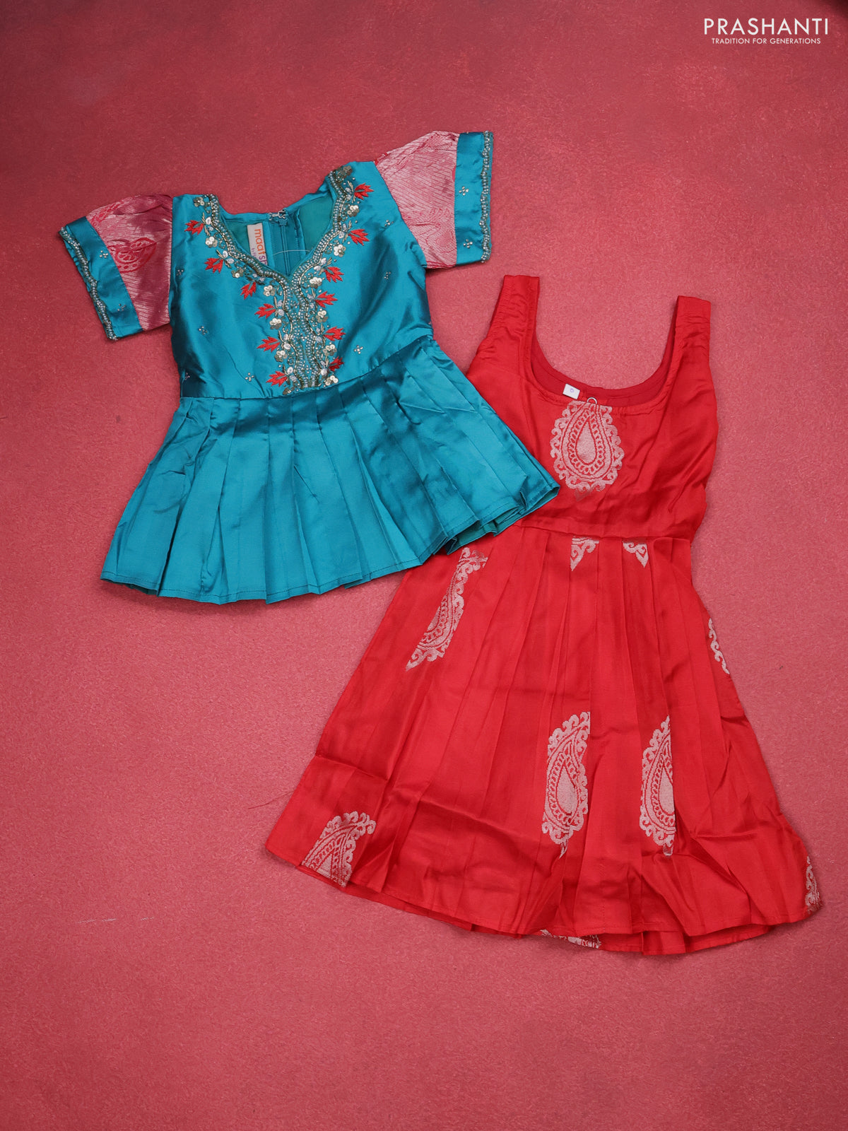 Silk kids lehenga teal blue and red with aari work neck pattern & puff sleeve and silver zari buttas & zari woven border