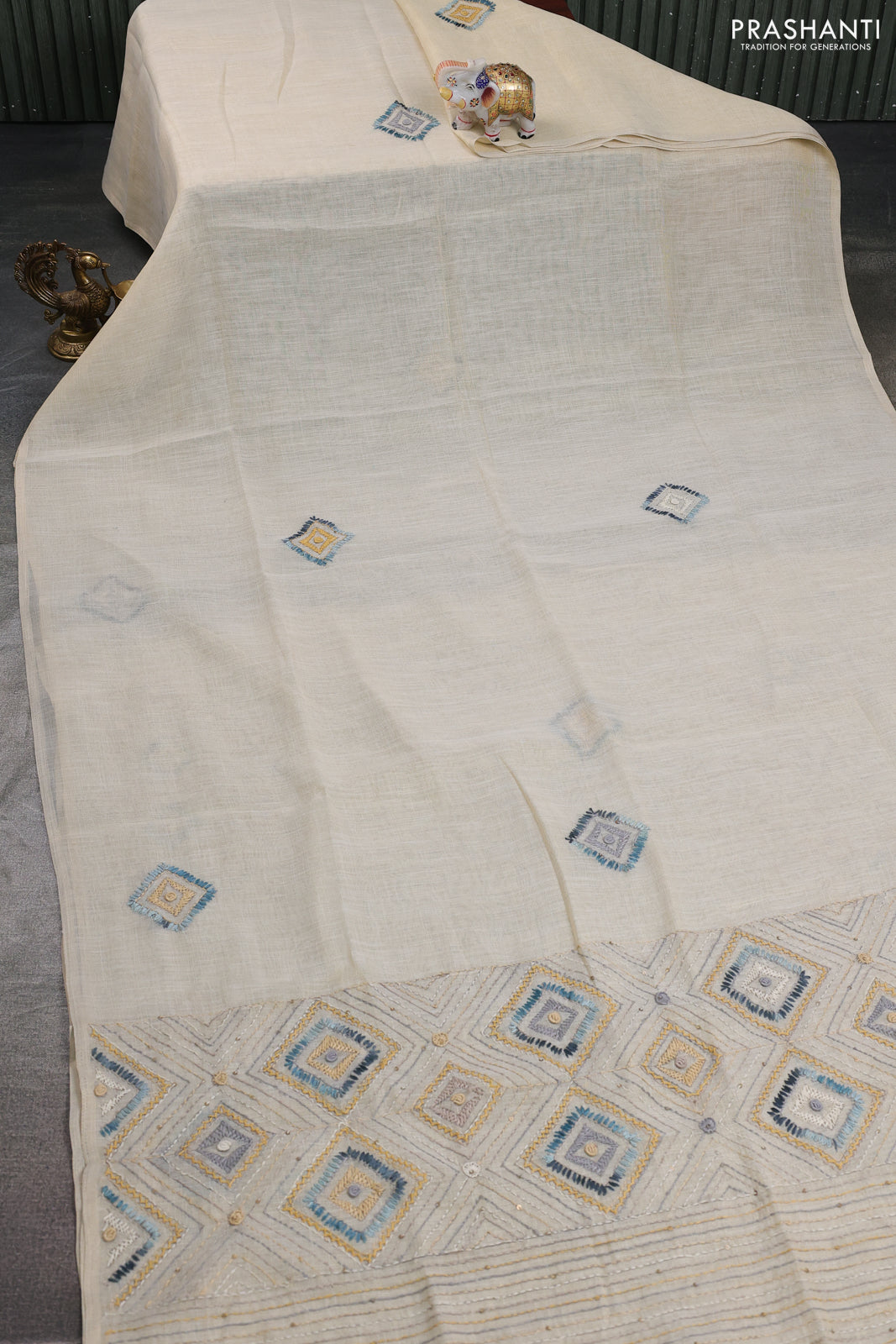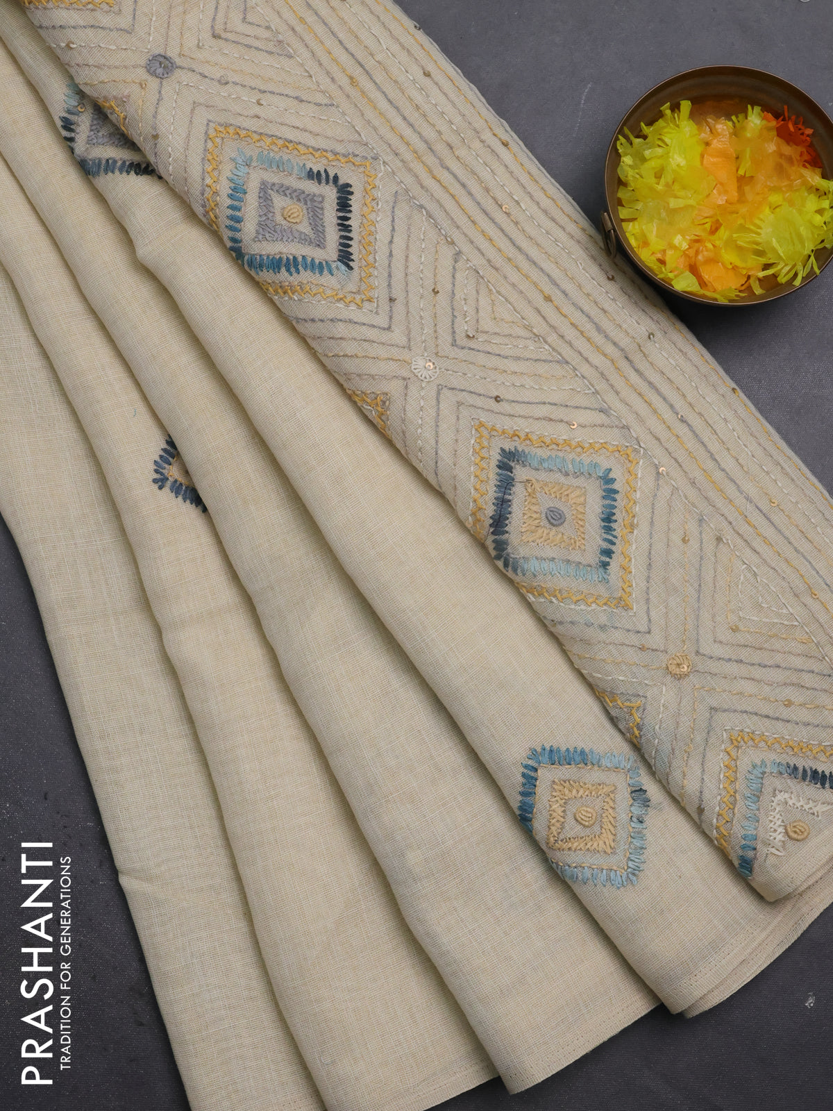 Tissue linen cotton saree cream and sandal with embroidery buttas and embroidery pallu