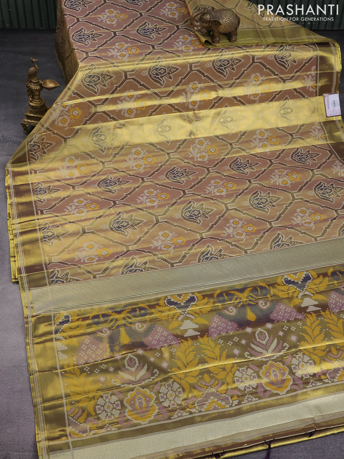 Tissue paithani saree dual shade of gold and mehendi green with allover ikat thread weaves and rettapet border