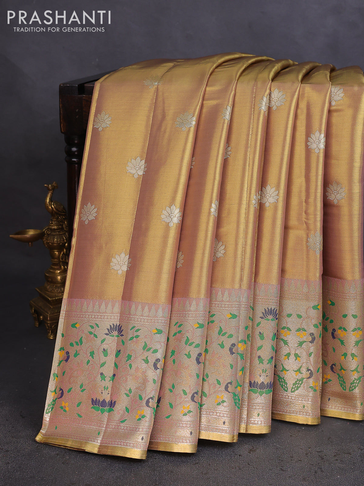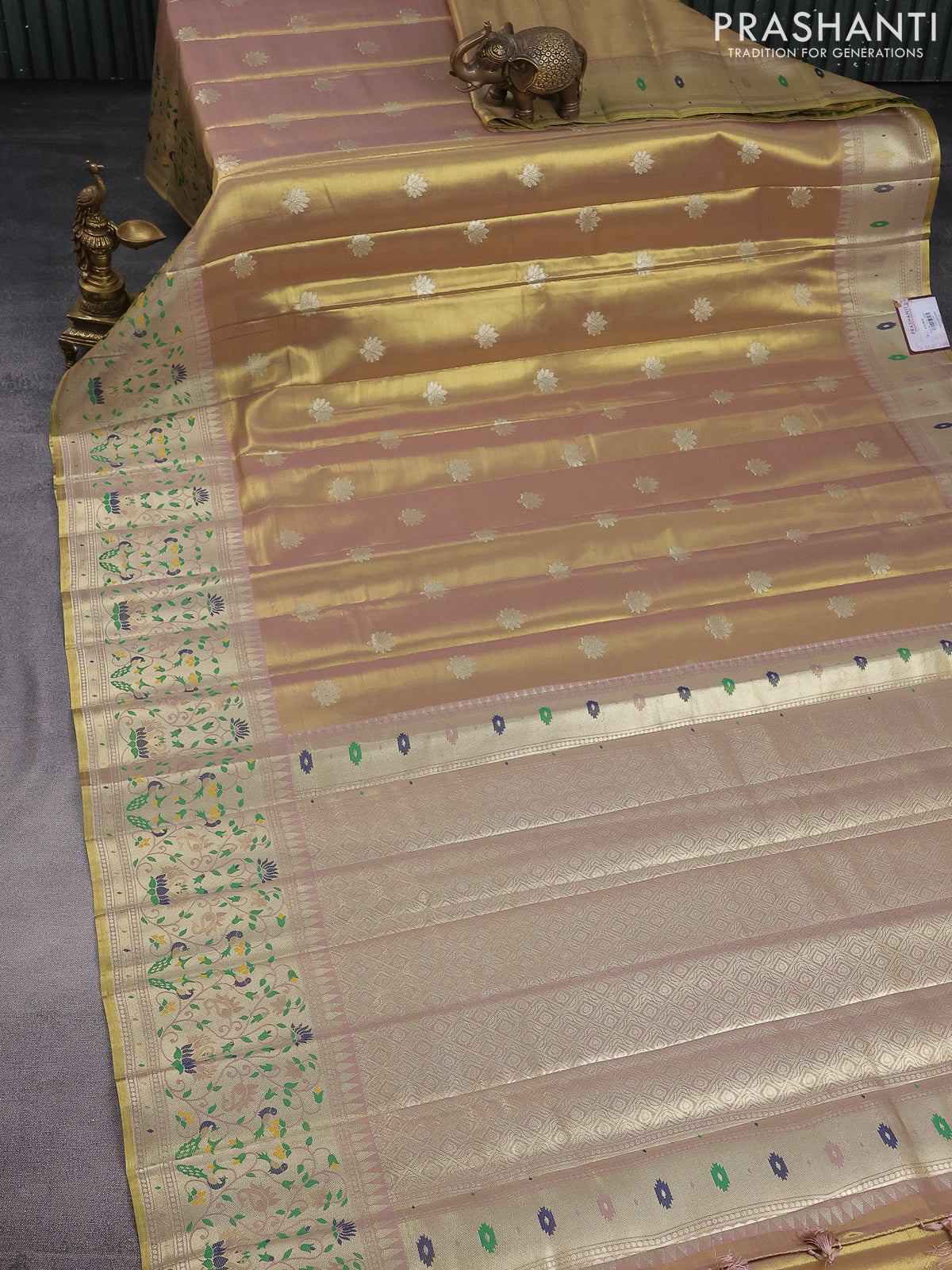Tissue paithani saree dual shade of gold and pastel pink with zari woven buttas and zari woven paithani style border