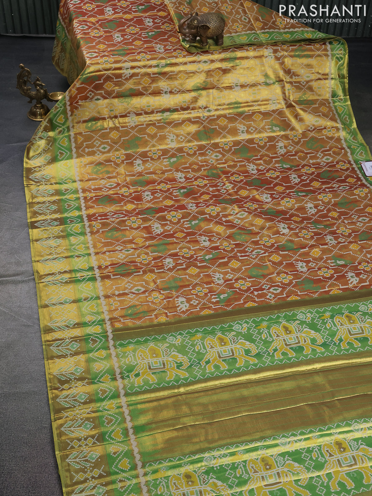 Tissue paithani saree dual shade of goldish maroon and green with allover ikat thread weaves and paithani style border