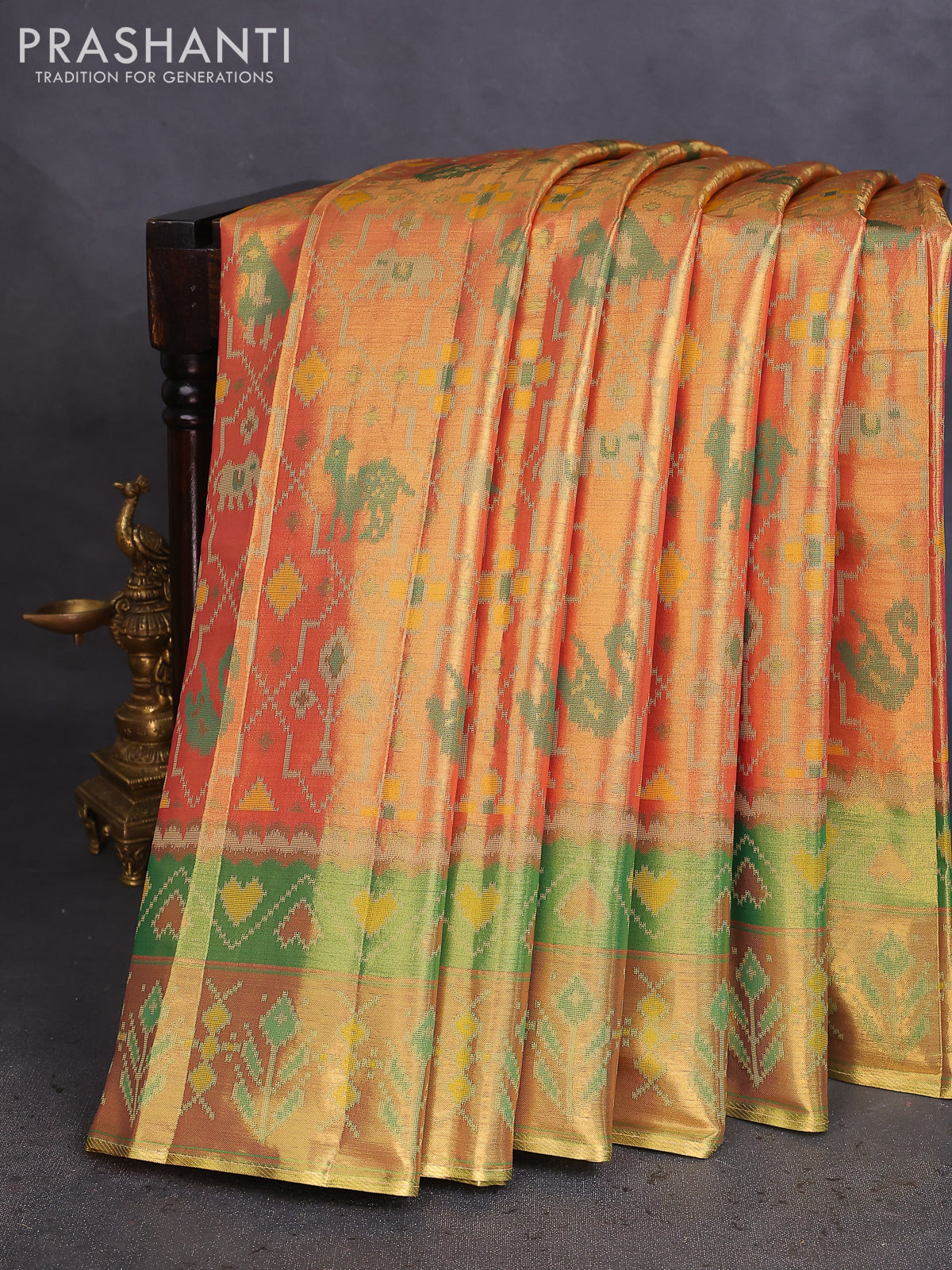 Tissue paithani saree dual shade of peach pink and green with allover ikat thread weaves and paithani style border
