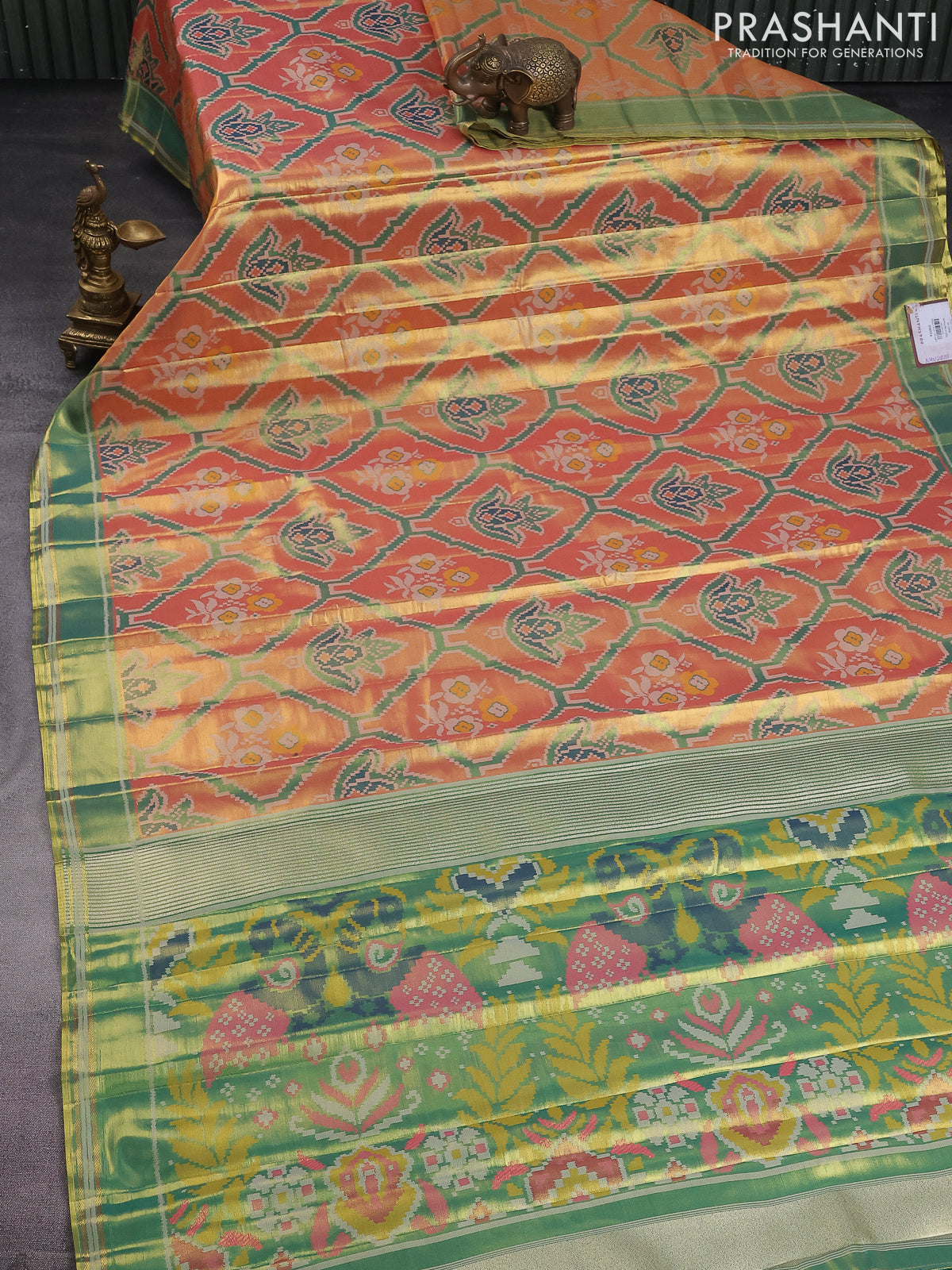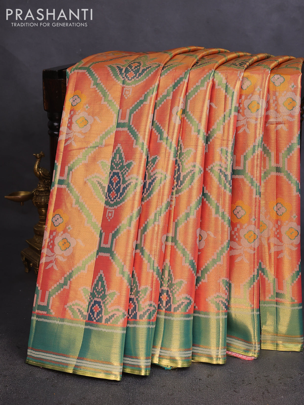 Tissue paithani saree dual shade of peach pink and teal green with allover ikat thread weaves and rettapet border