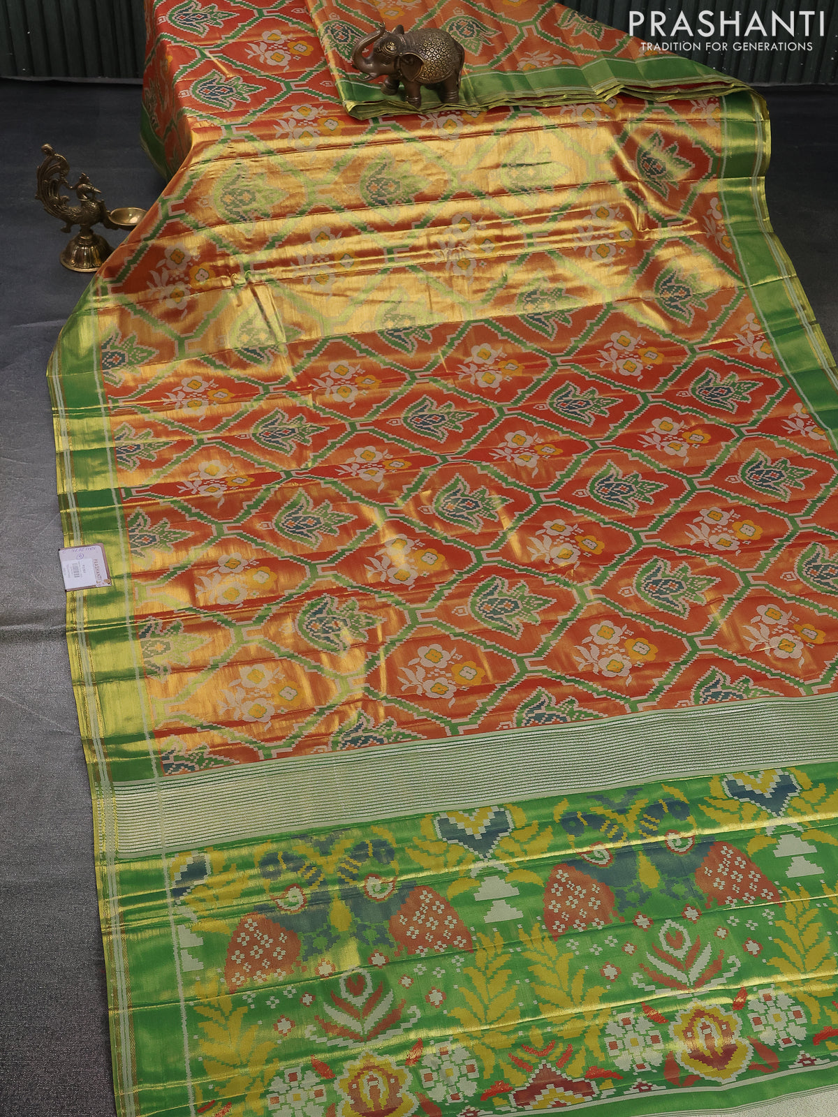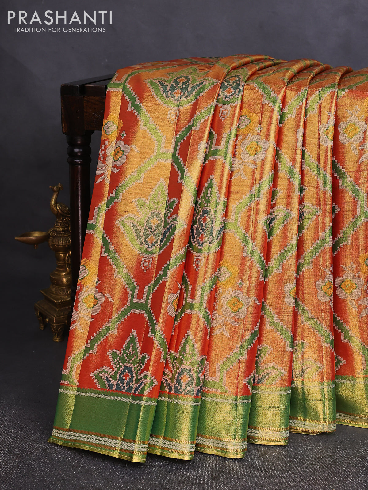 Tissue paithani saree dual shade of reddish gold and green with allover ikat thread weaves and rettapet border