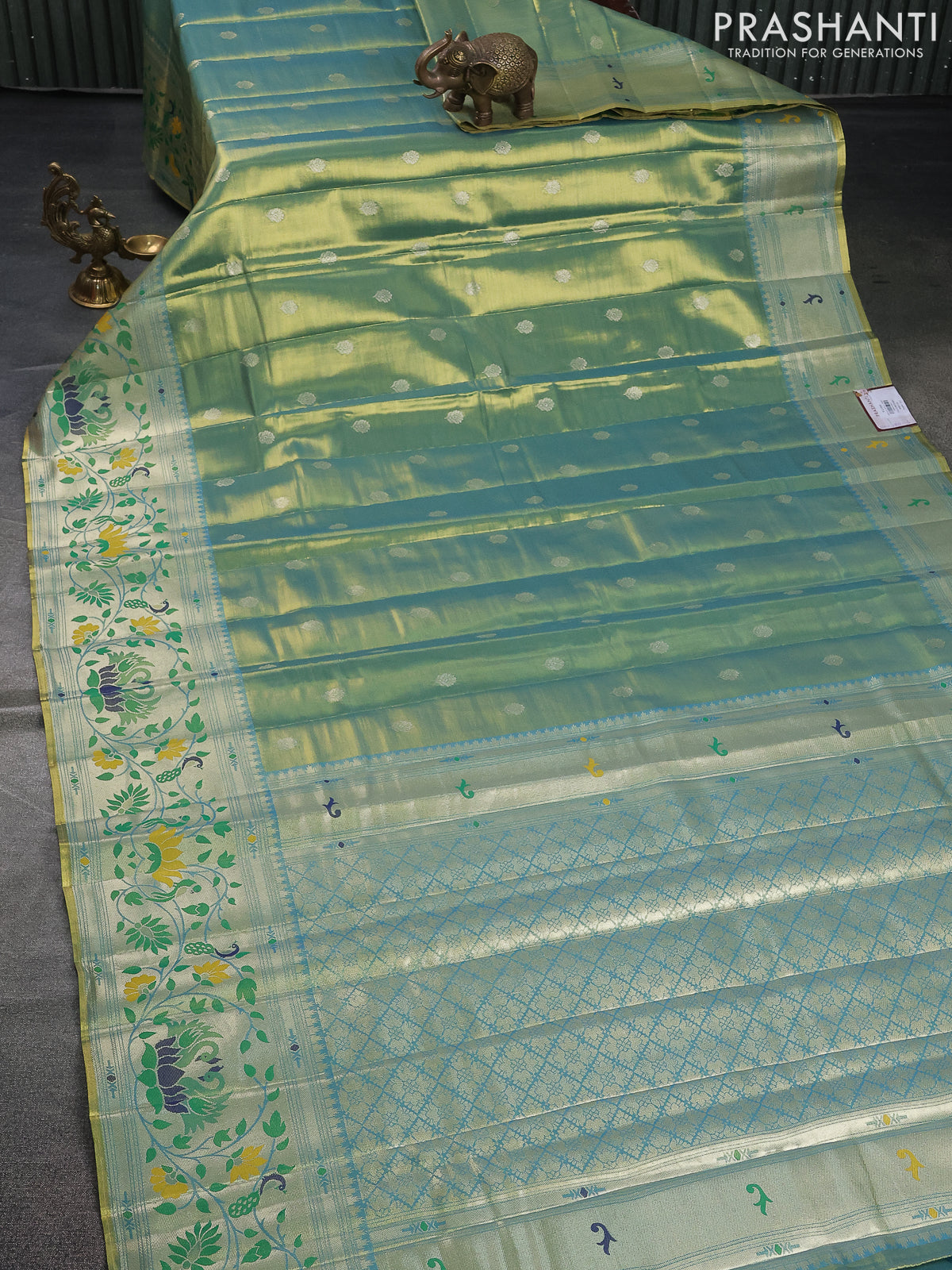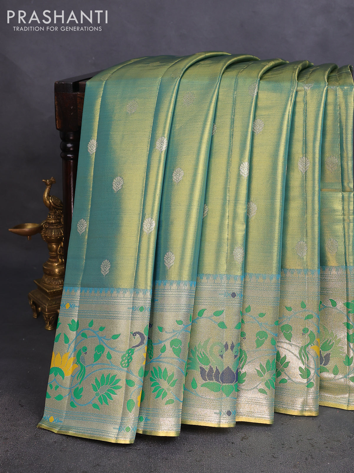 Tissue paithani saree dual shade of teal blue with zari woven buttas and zari woven paithani style border