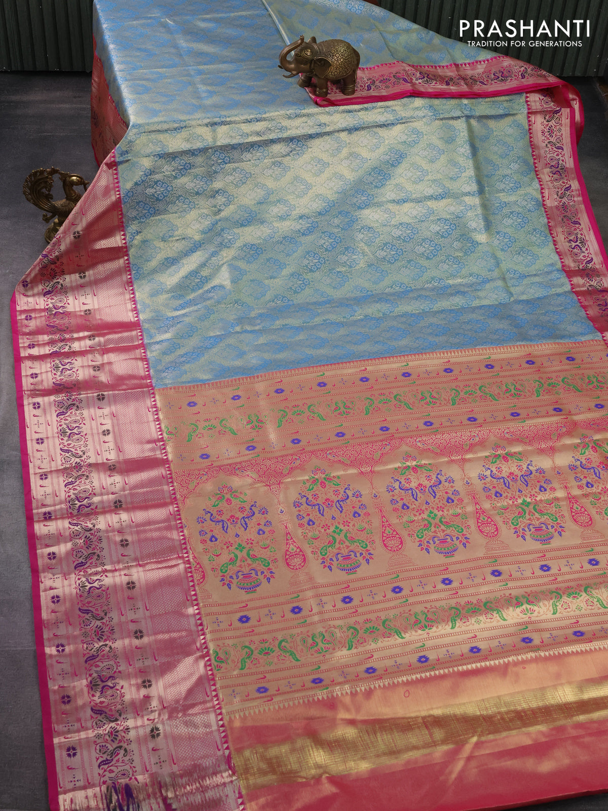 Tissue paithani silk saree blue and pink with allover silver zari woven brocade weaves and long zari woven paithani style border