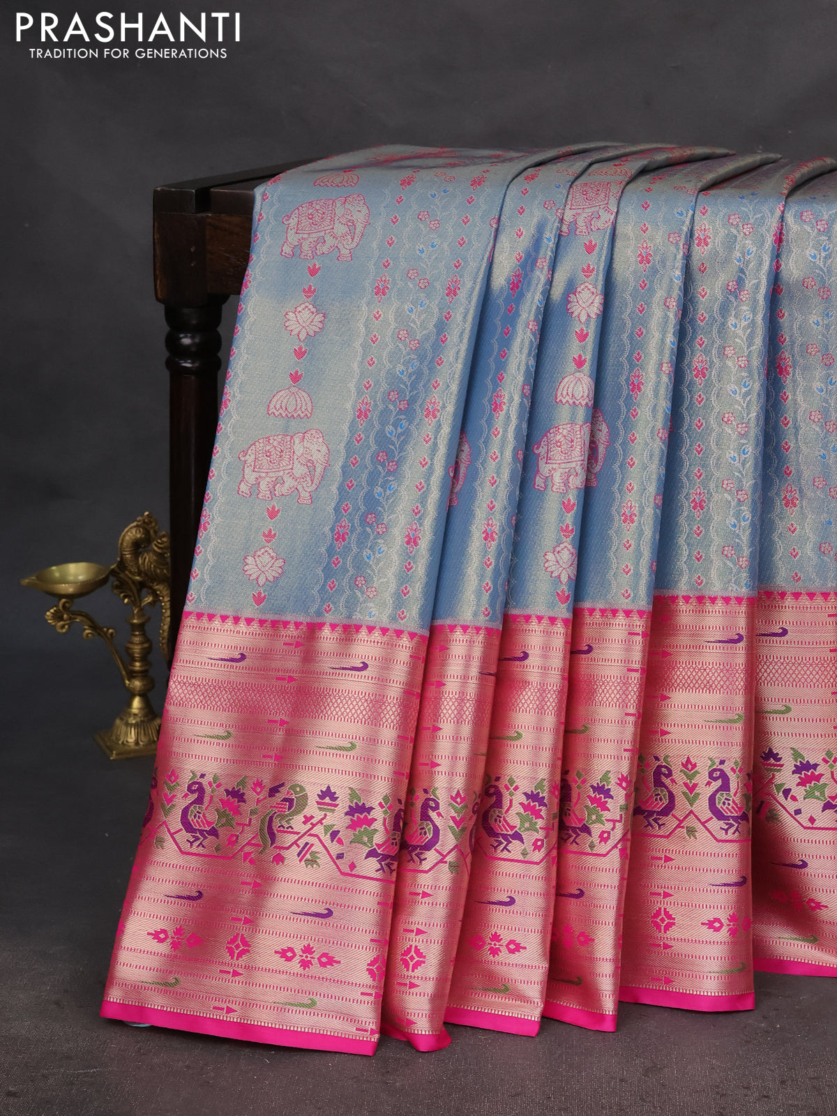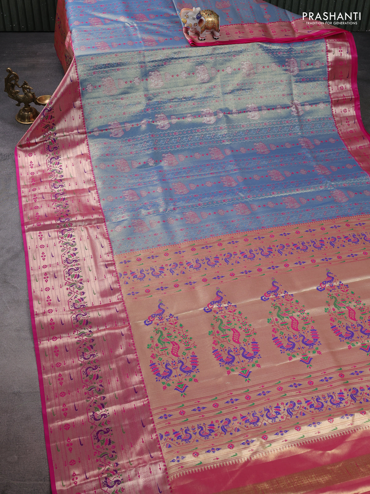 Tissue paithani silk saree blue and pink with allover zari woven brocade weaves and long zari woven paithani style border