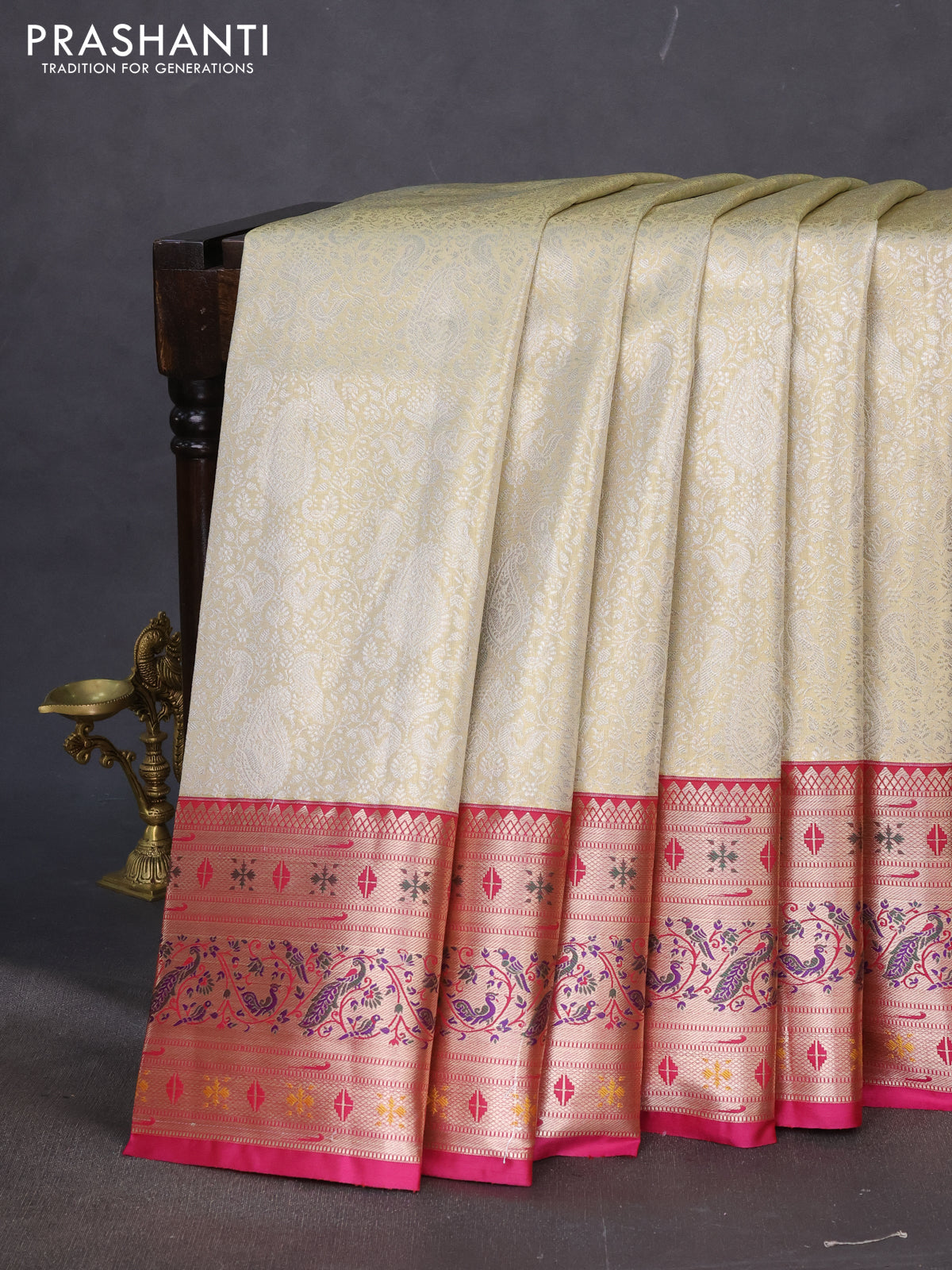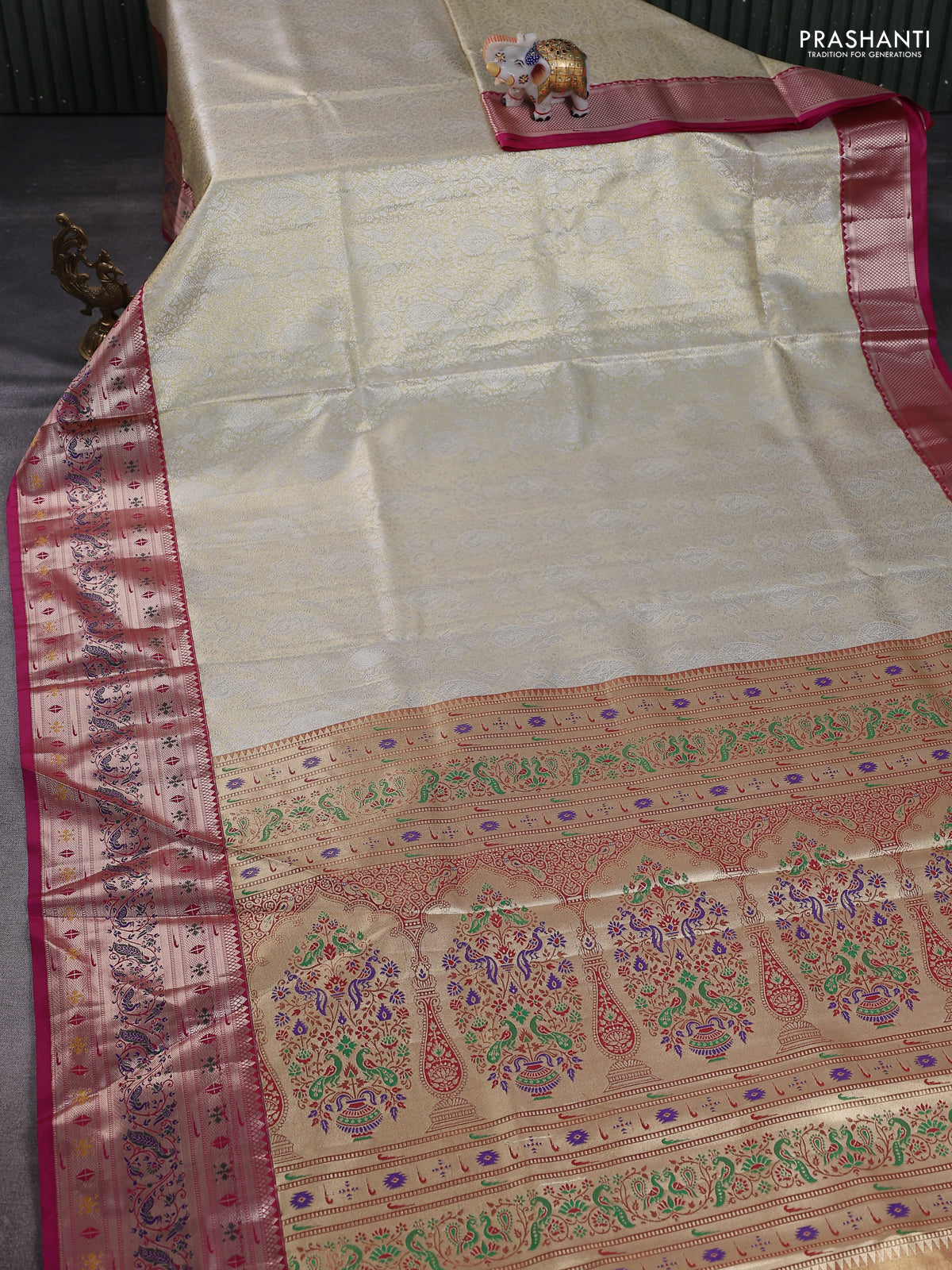 Tissue paithani silk saree cream and magenta pink with allover zari woven brocade weaves and long zari woven paithani style border