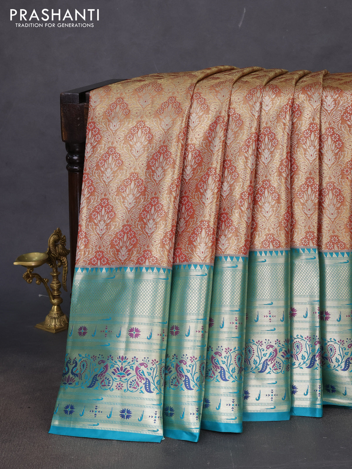 Tissue paithani silk saree dual shade of gold and teal green with allover silver zari woven brocade weaves and long zari woven paithani style border