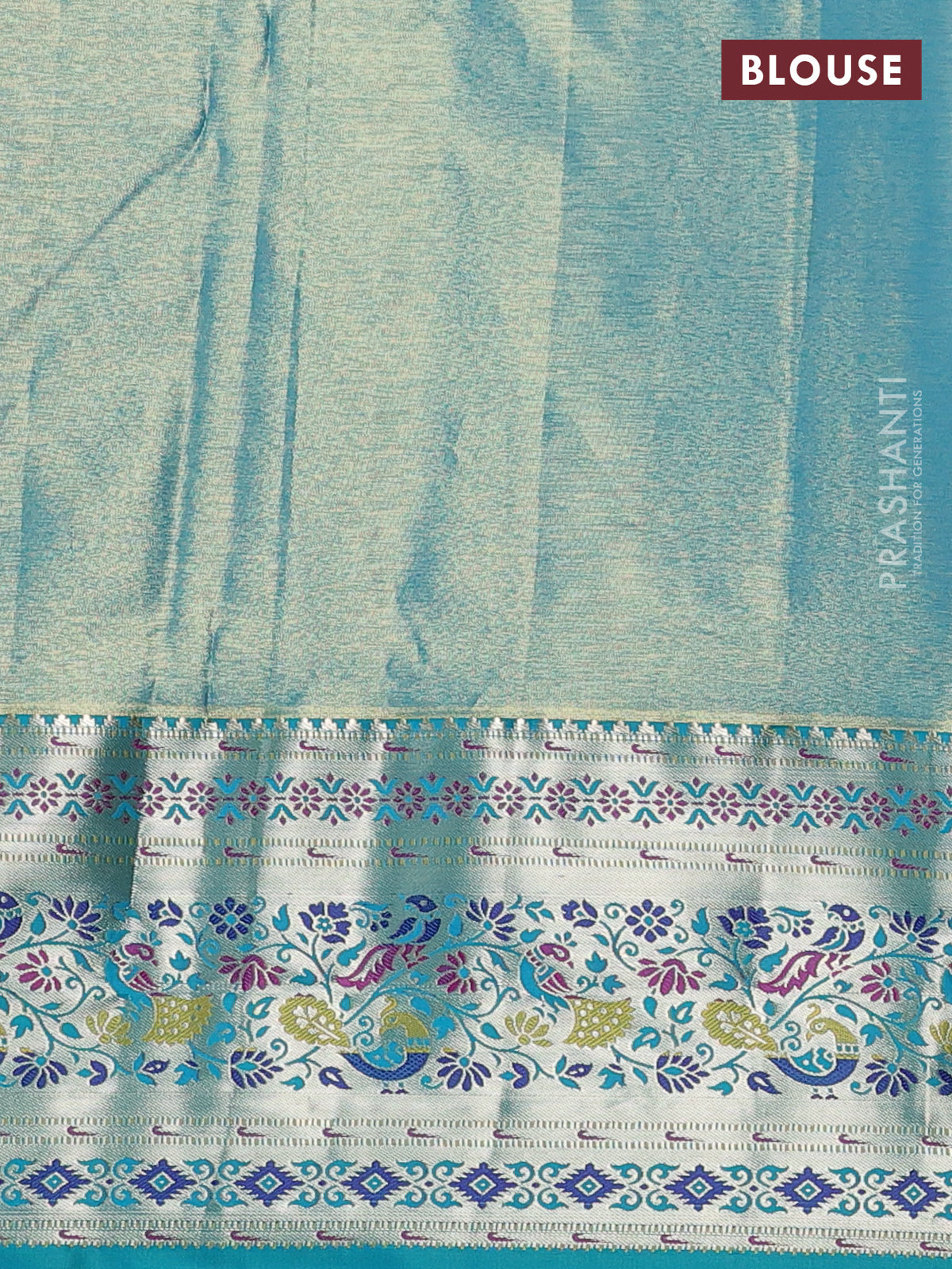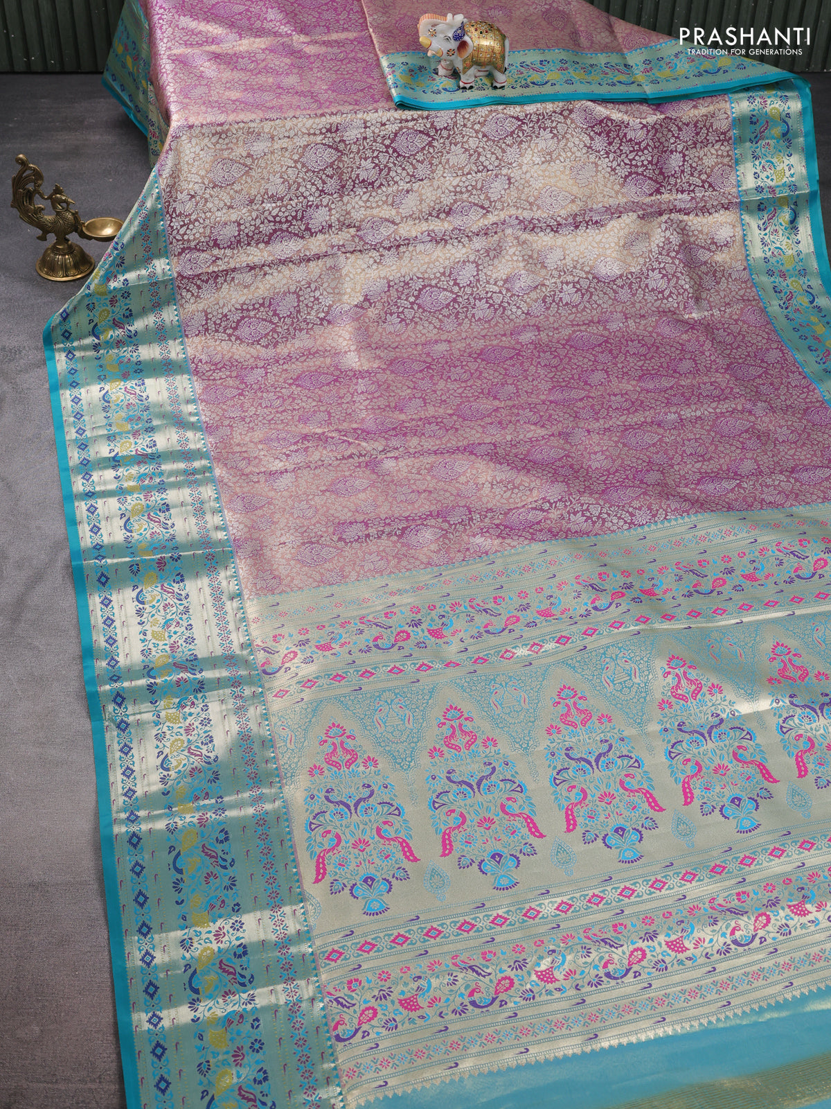 Tissue paithani silk saree dual shade of lavender and teal green with allover silver zari woven brocade weaves and zari woven paithani style border