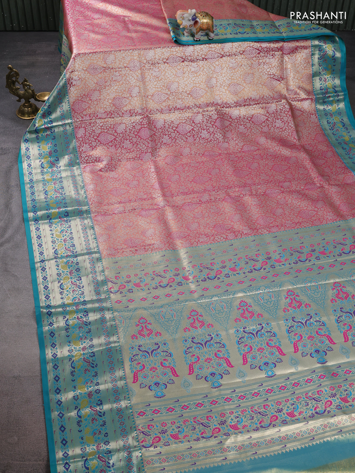 Tissue paithani silk saree dual shade of light pink and teal blue with allover silver zari woven brocade weaves and zari woven paithani style border