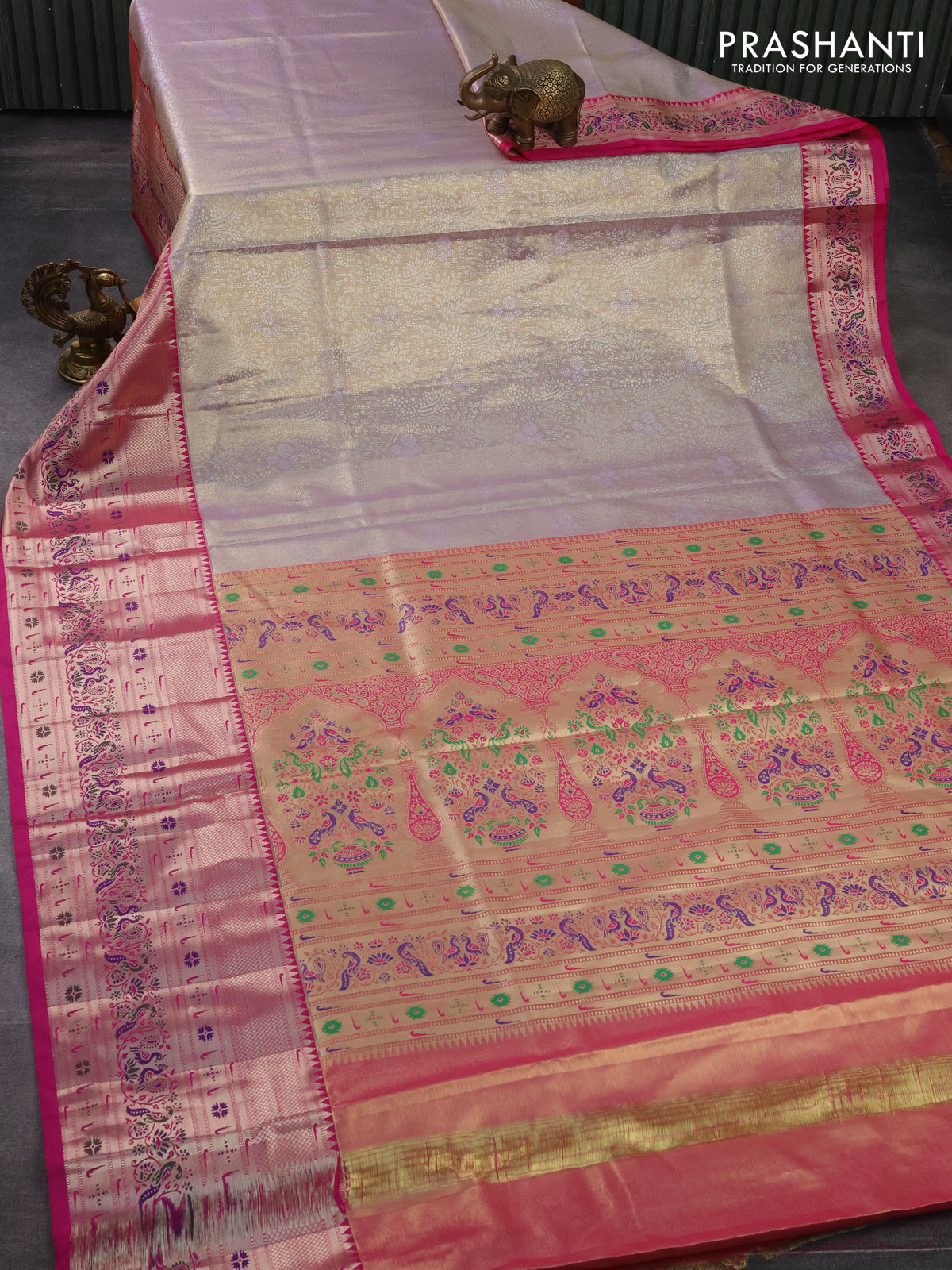 Tissue paithani silk saree dual shade of pastel lavender and pink with allover silver zari woven brocade weaves and long zari woven paithani style border