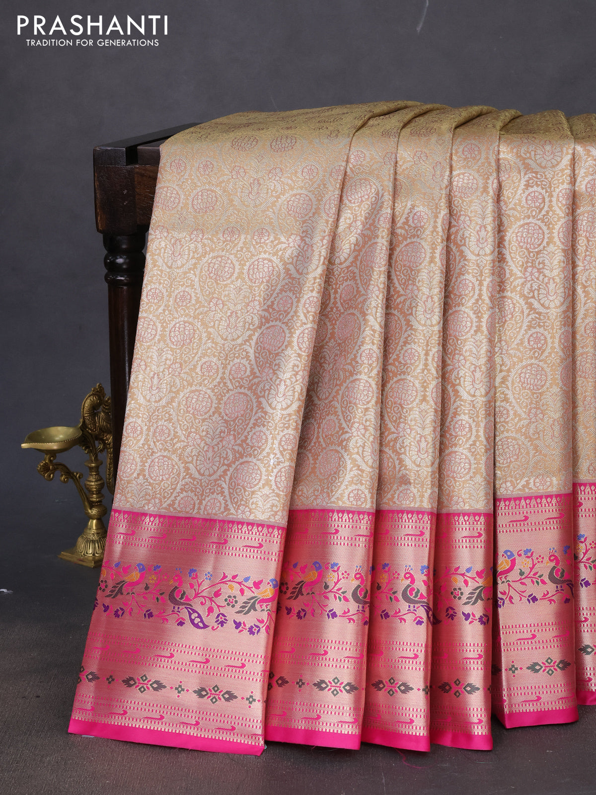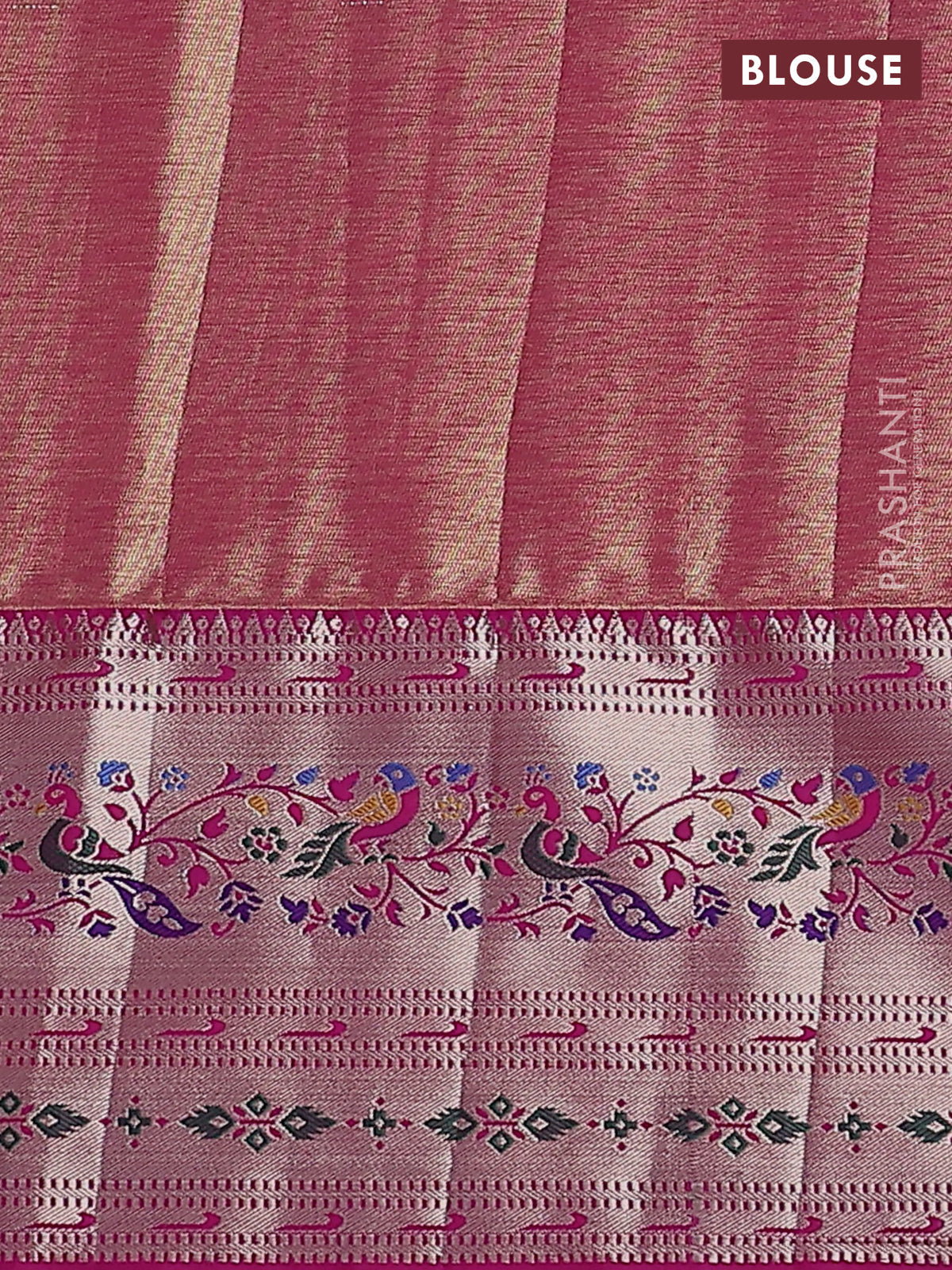 Tissue paithani silk saree dual shade of pastel peach and pink with allover silver zari woven brocade weaves and zari woven paithani style border