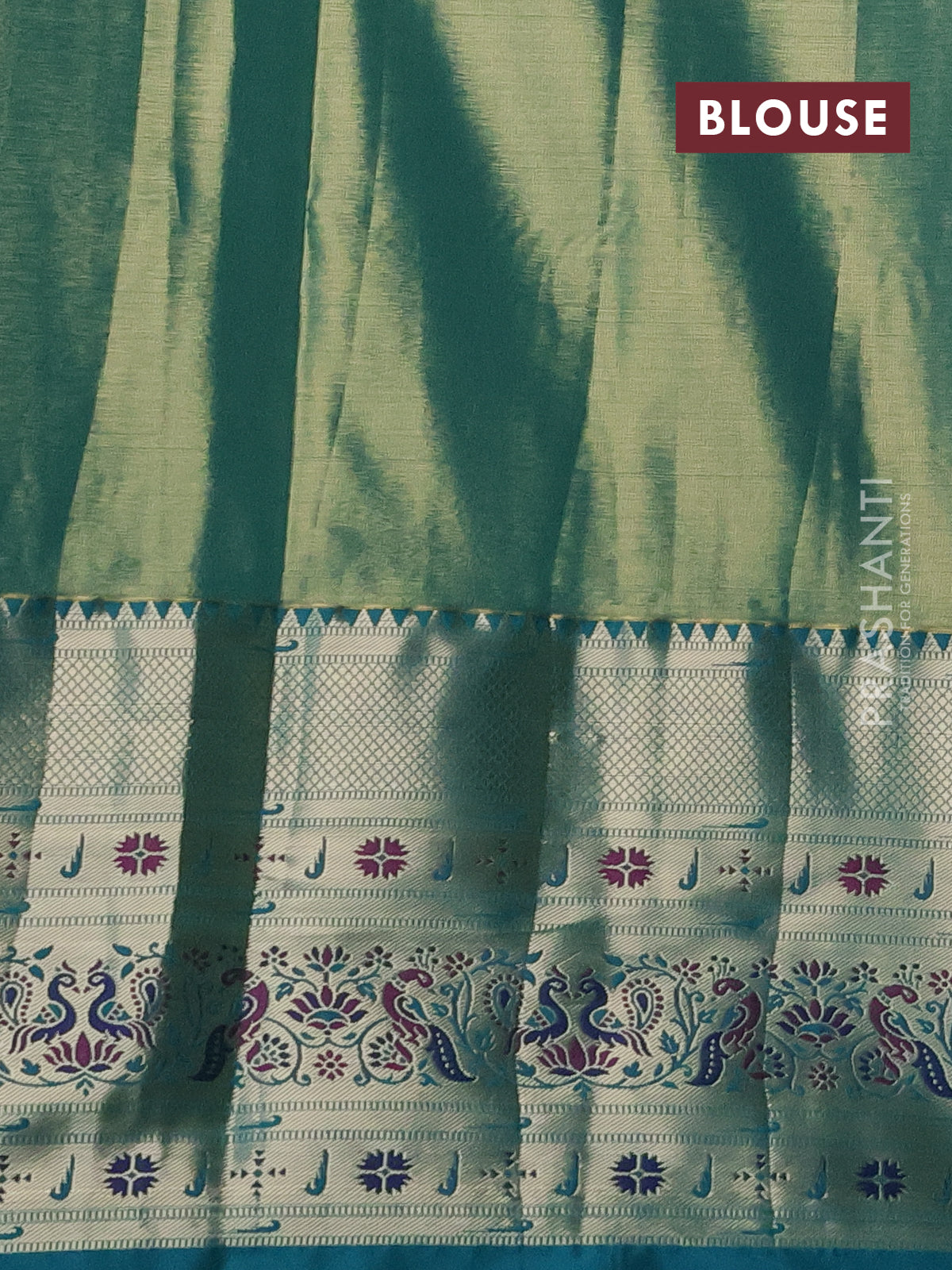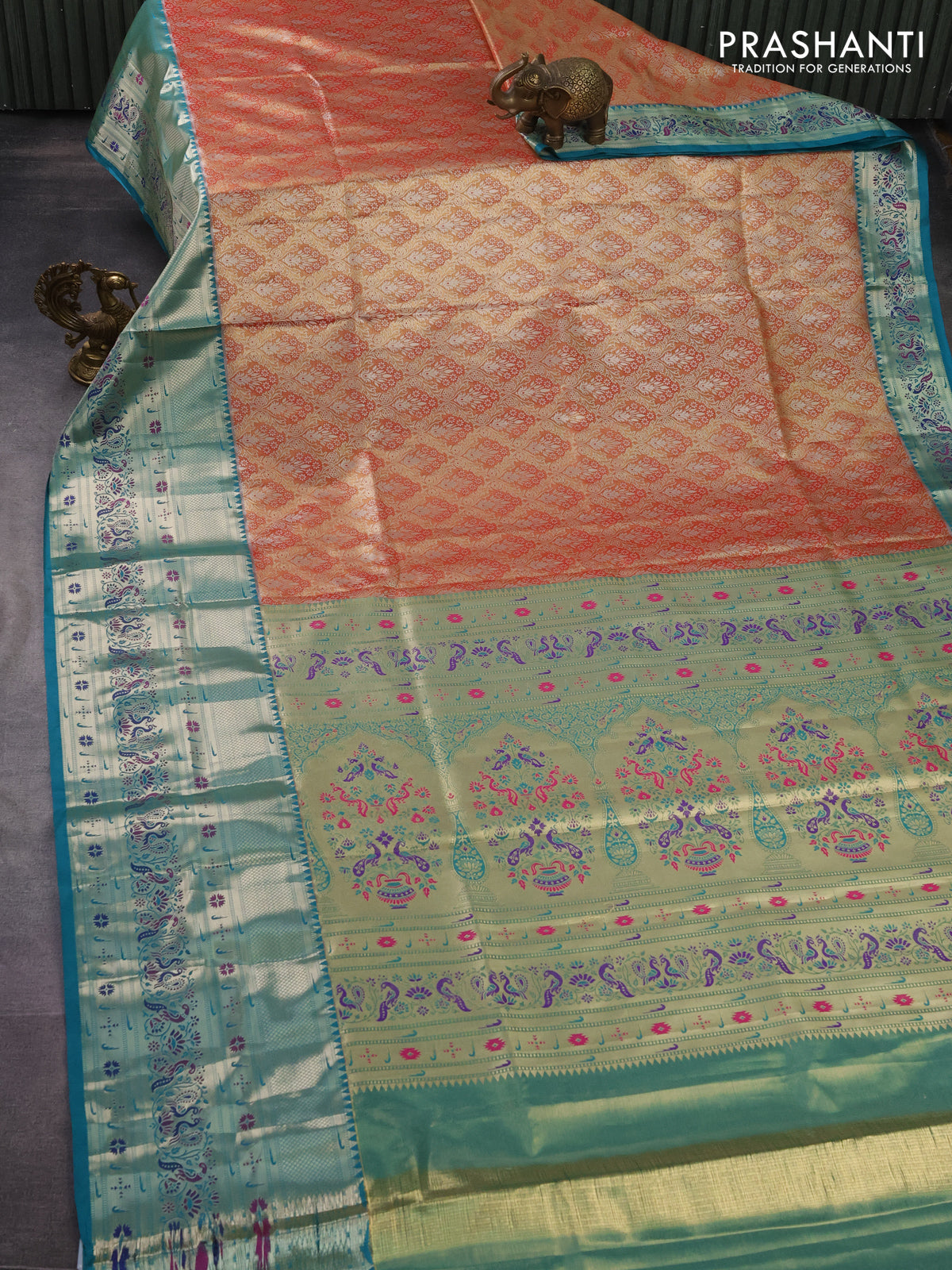 Tissue paithani silk saree dual shade of reddish gold and teal green with allover zari woven brocade weaves and long zari woven paithani style border
