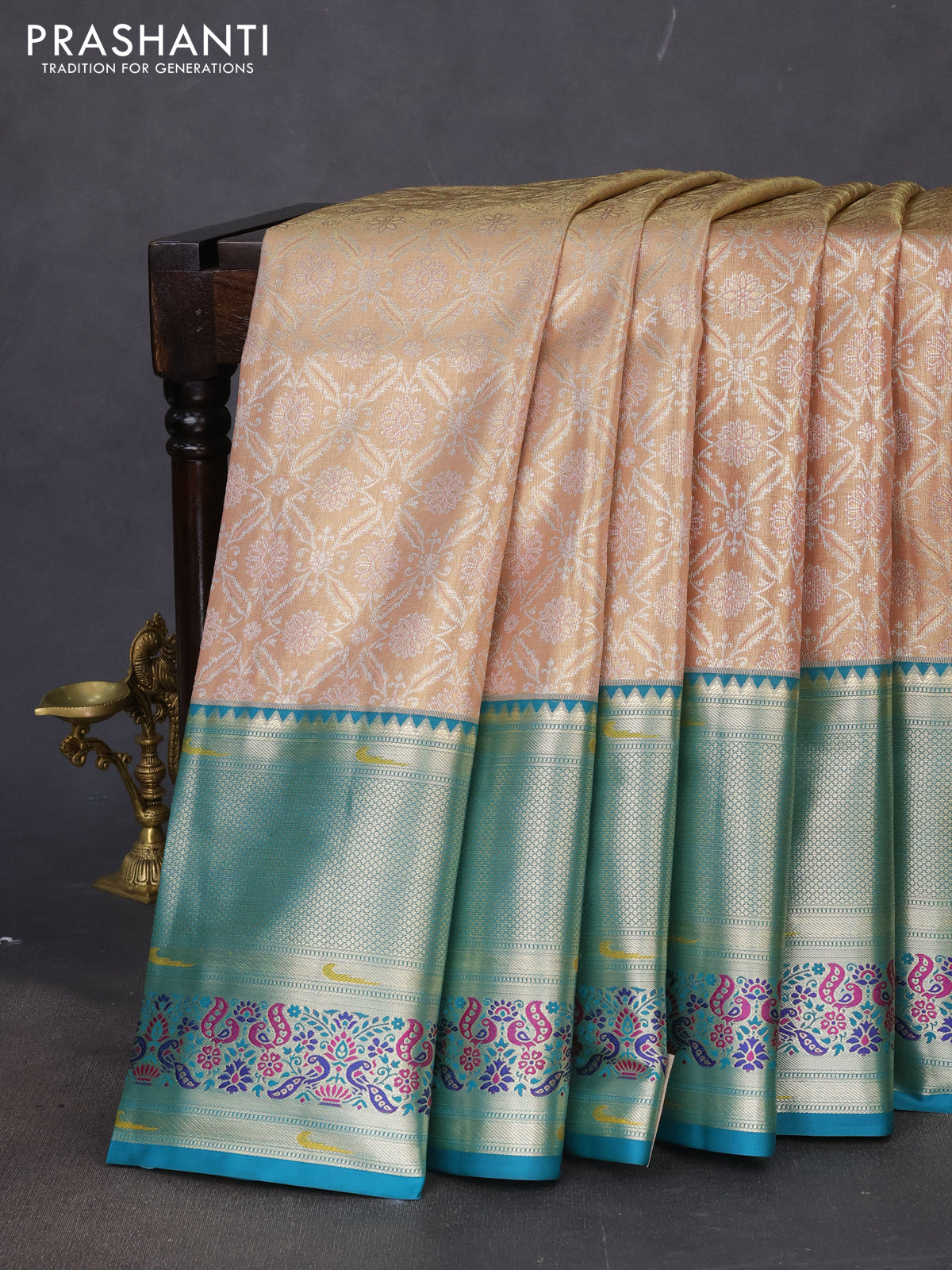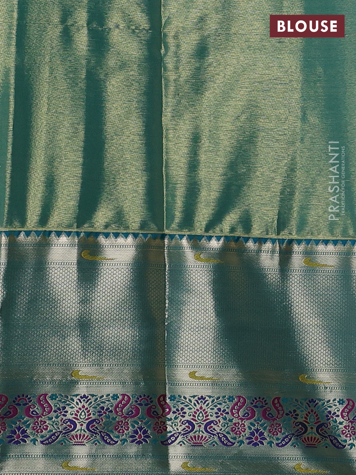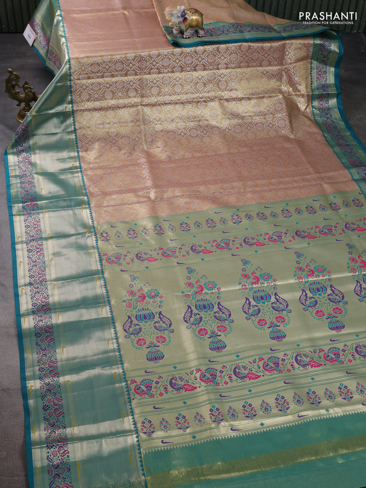 Tissue paithani silk saree dual shade of sandal and teal green with allover silver zari woven brocade weaves and long zari woven paithani style border