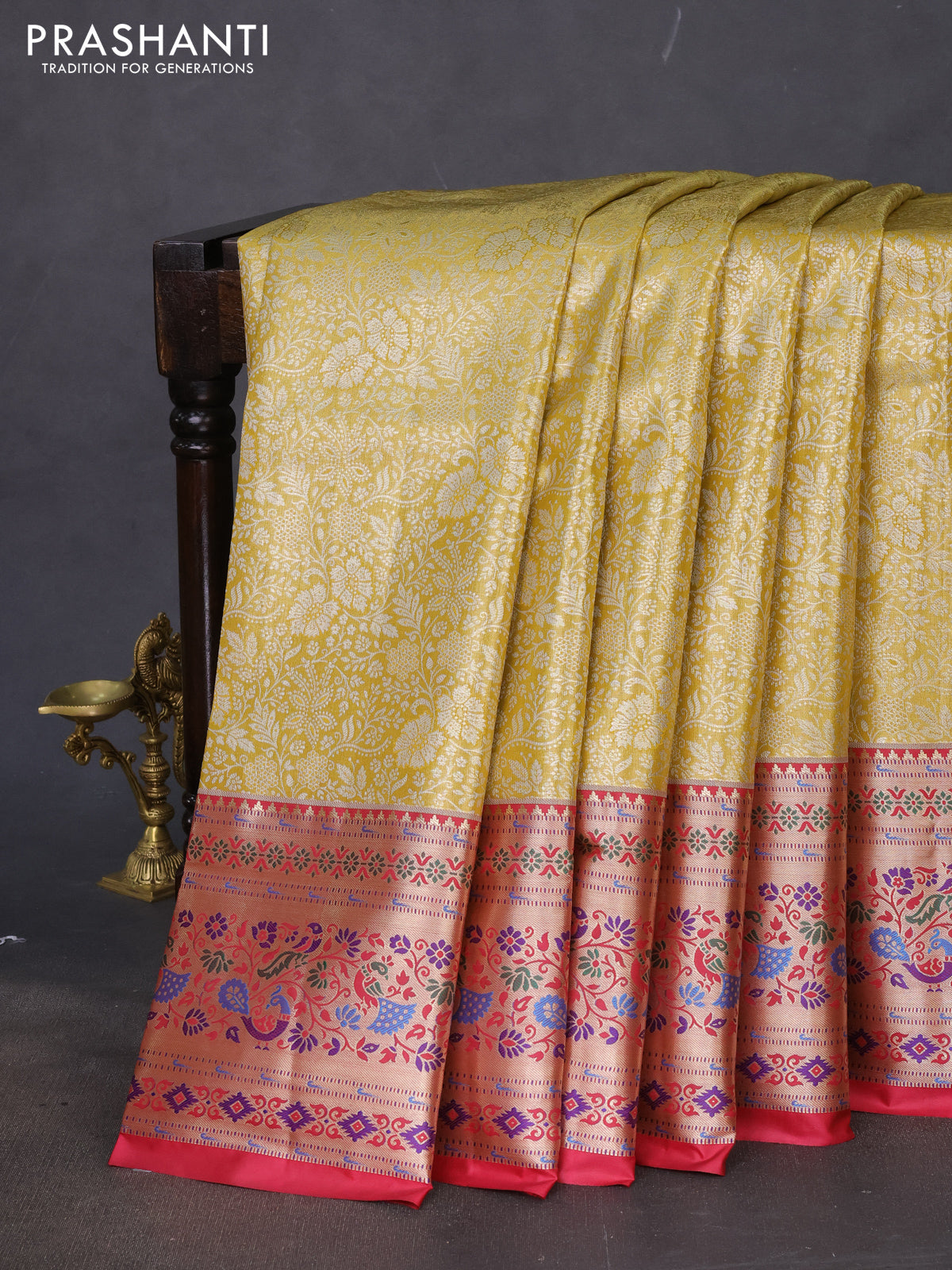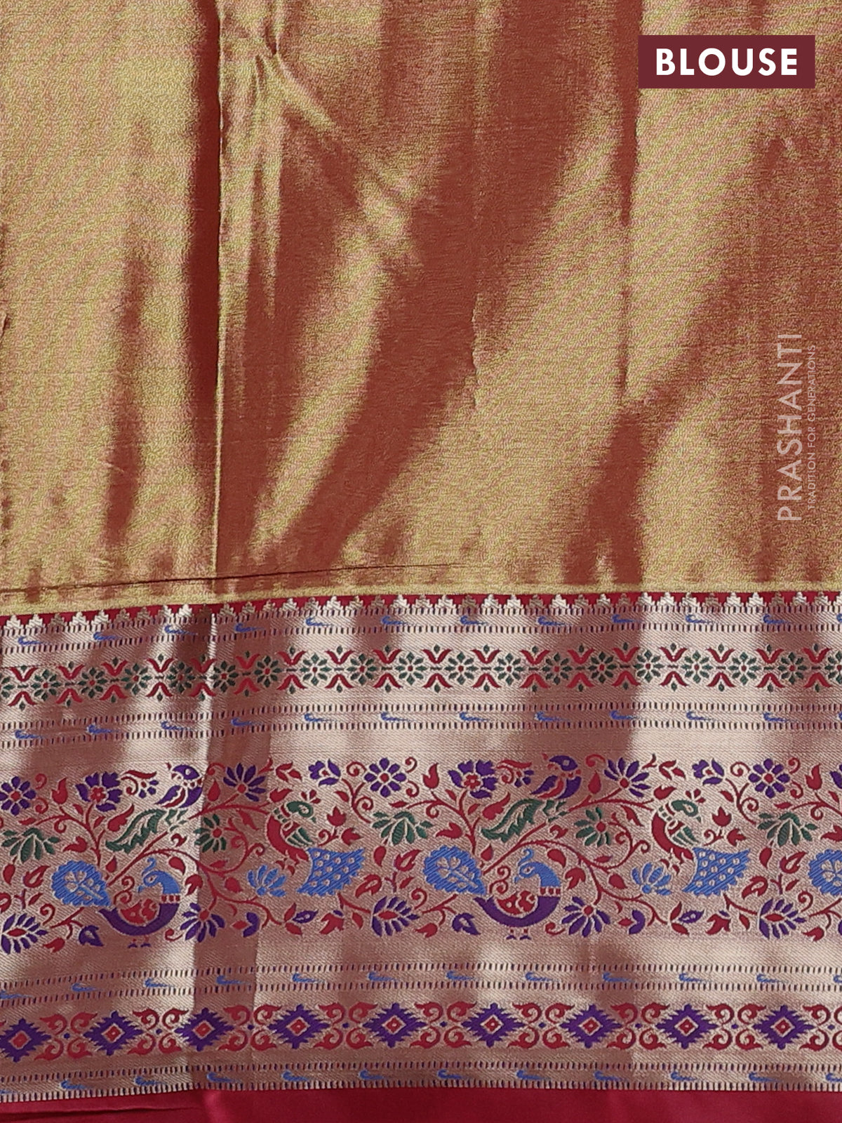 Tissue paithani silk saree gold and dark pink with allover silver zari woven brocade weaves and zari woven paithani style border