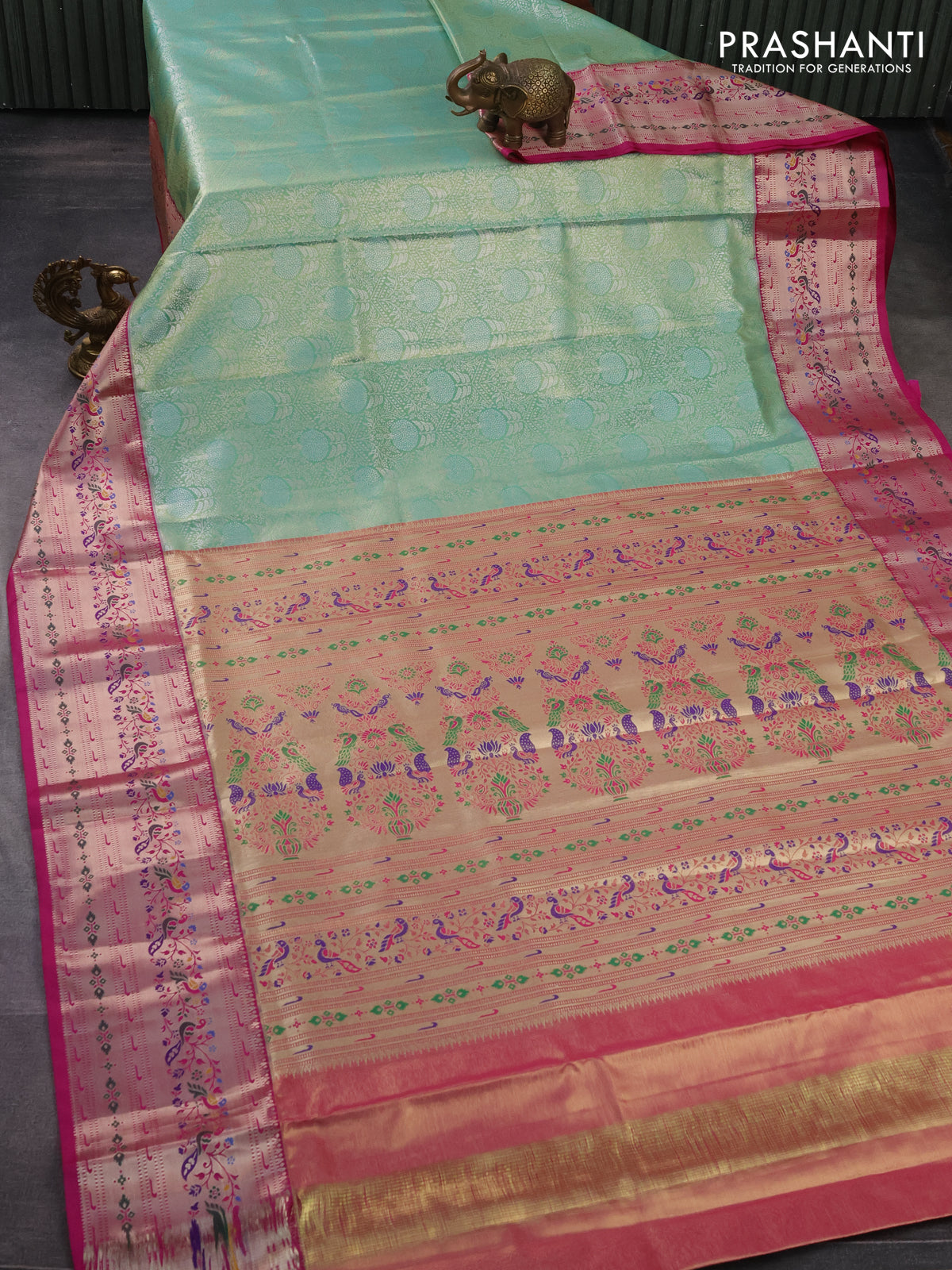 Tissue paithani silk saree green and pink with allover silver zari woven brocade weaves and zari woven paithani style border
