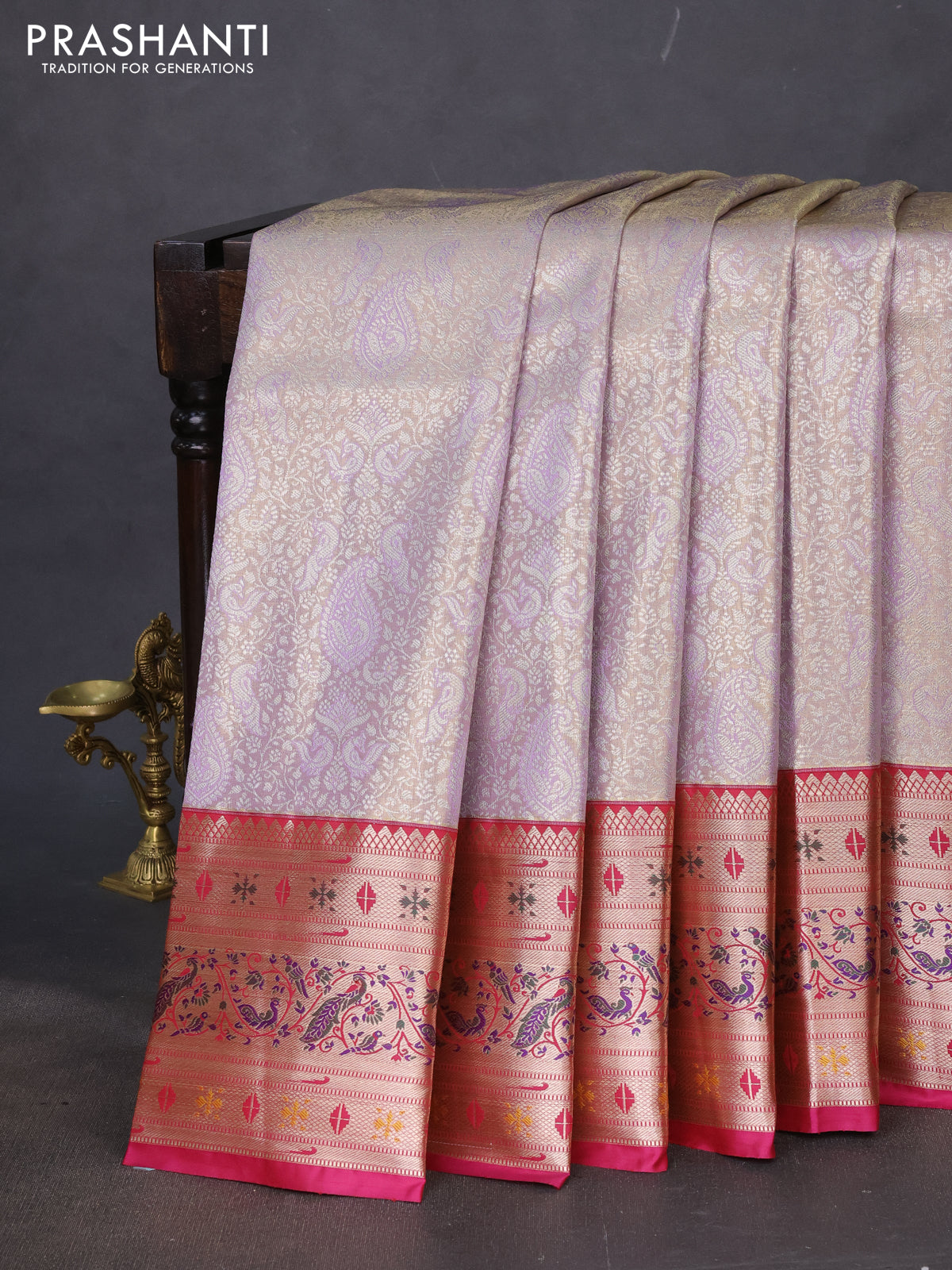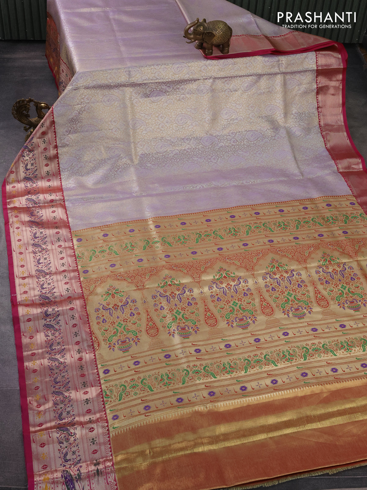 Tissue paithani silk saree lavender shade and pink with allover silver zari woven brocade weaves and zari woven paithani style border