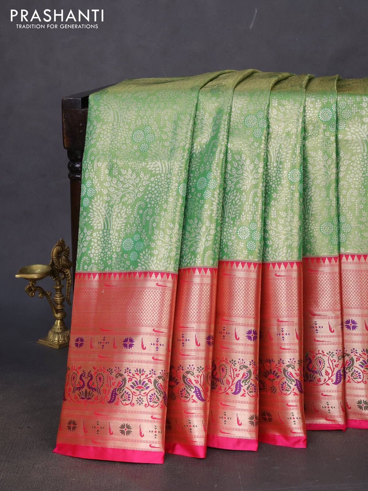 Tissue paithani silk saree light green and pink with allover silver zari woven brocade weaves and long zari woven paithani style border