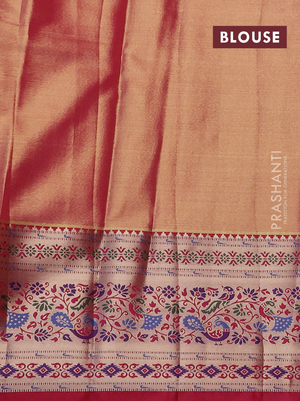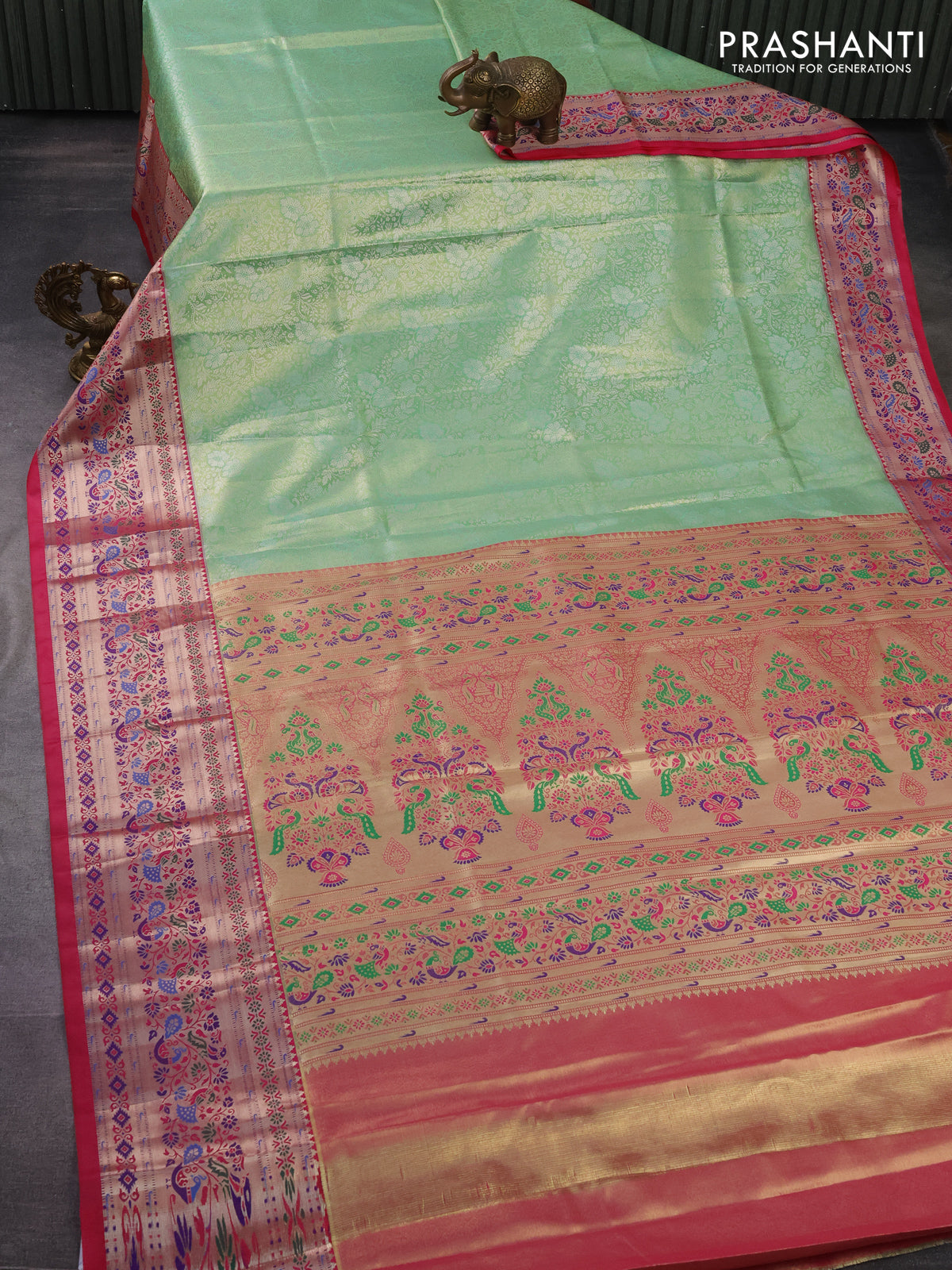 Tissue paithani silk saree light green and pink with allover silver zari woven brocade weaves and zari woven paithani style border