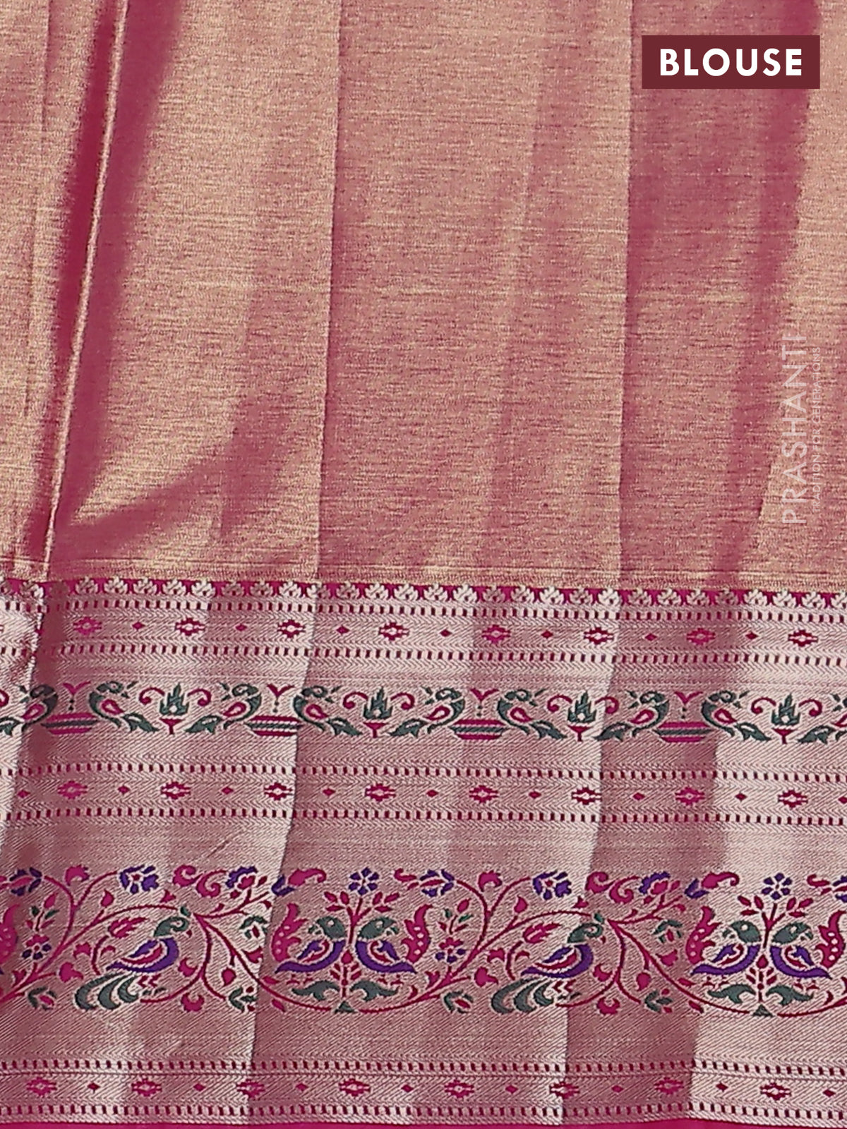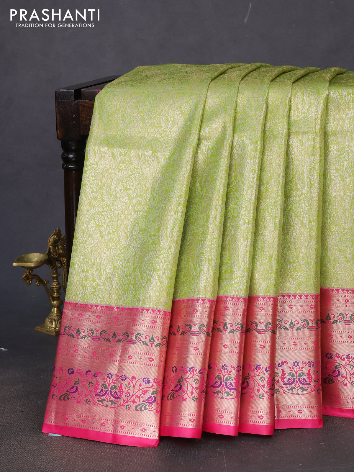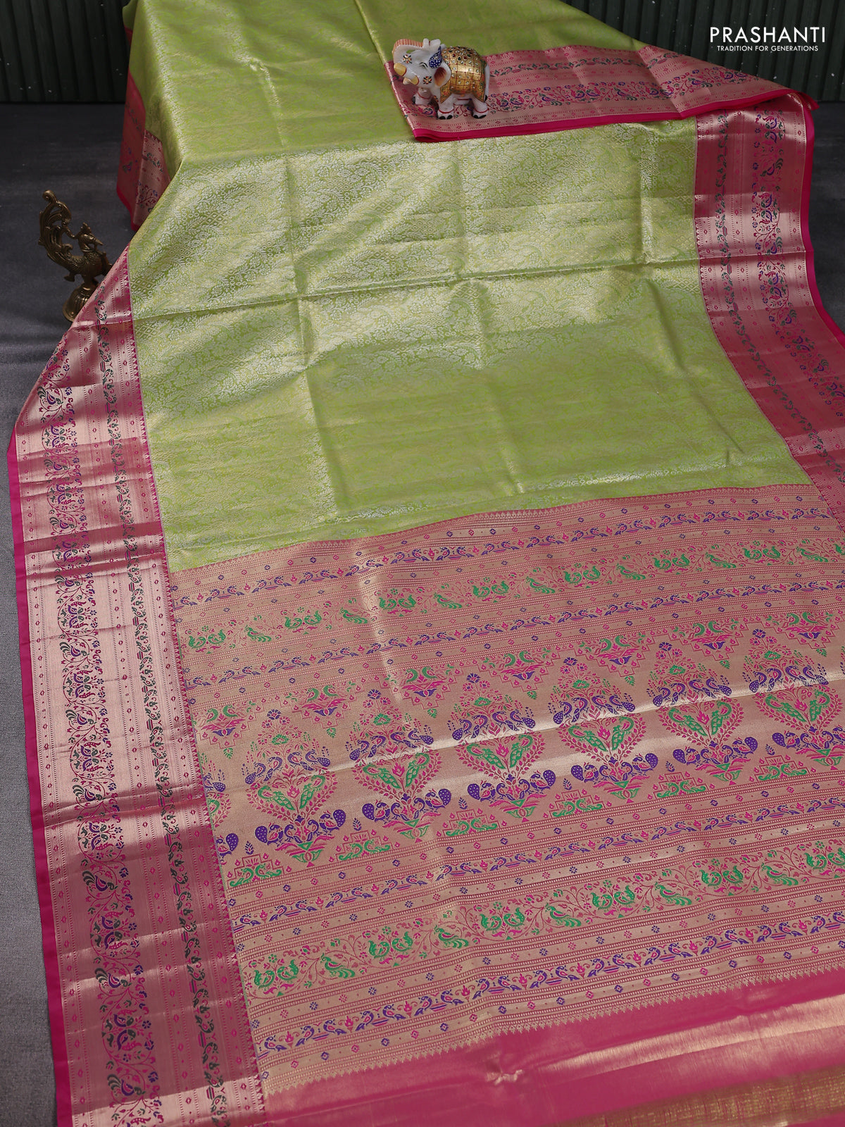 Tissue paithani silk saree lime green and pink with allover zari woven brocade weaves and zari woven paithani style border