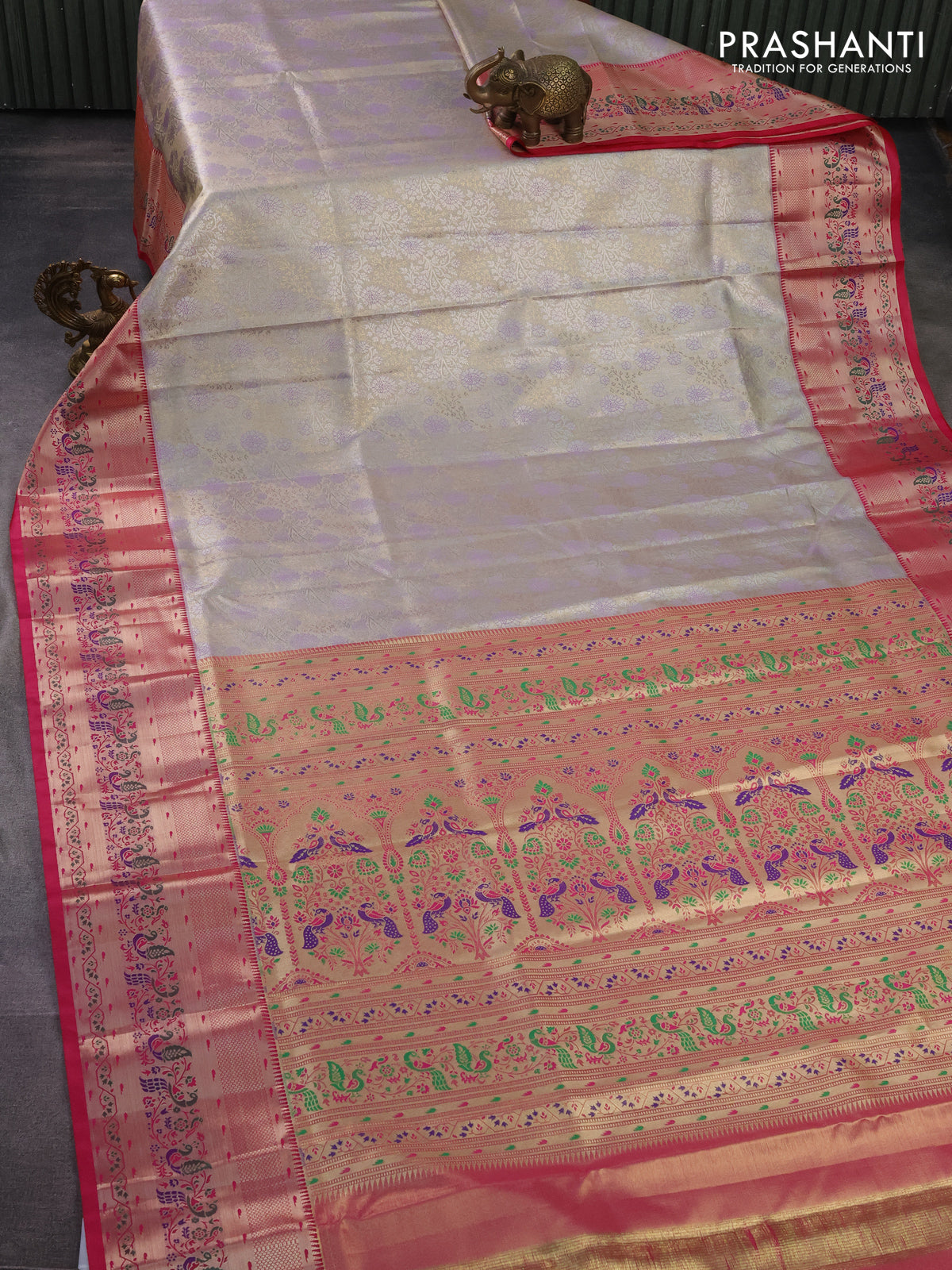 Tissue paithani silk saree mild lavender and pink with allover silver zari woven brocade weaves and zari woven paithani style border