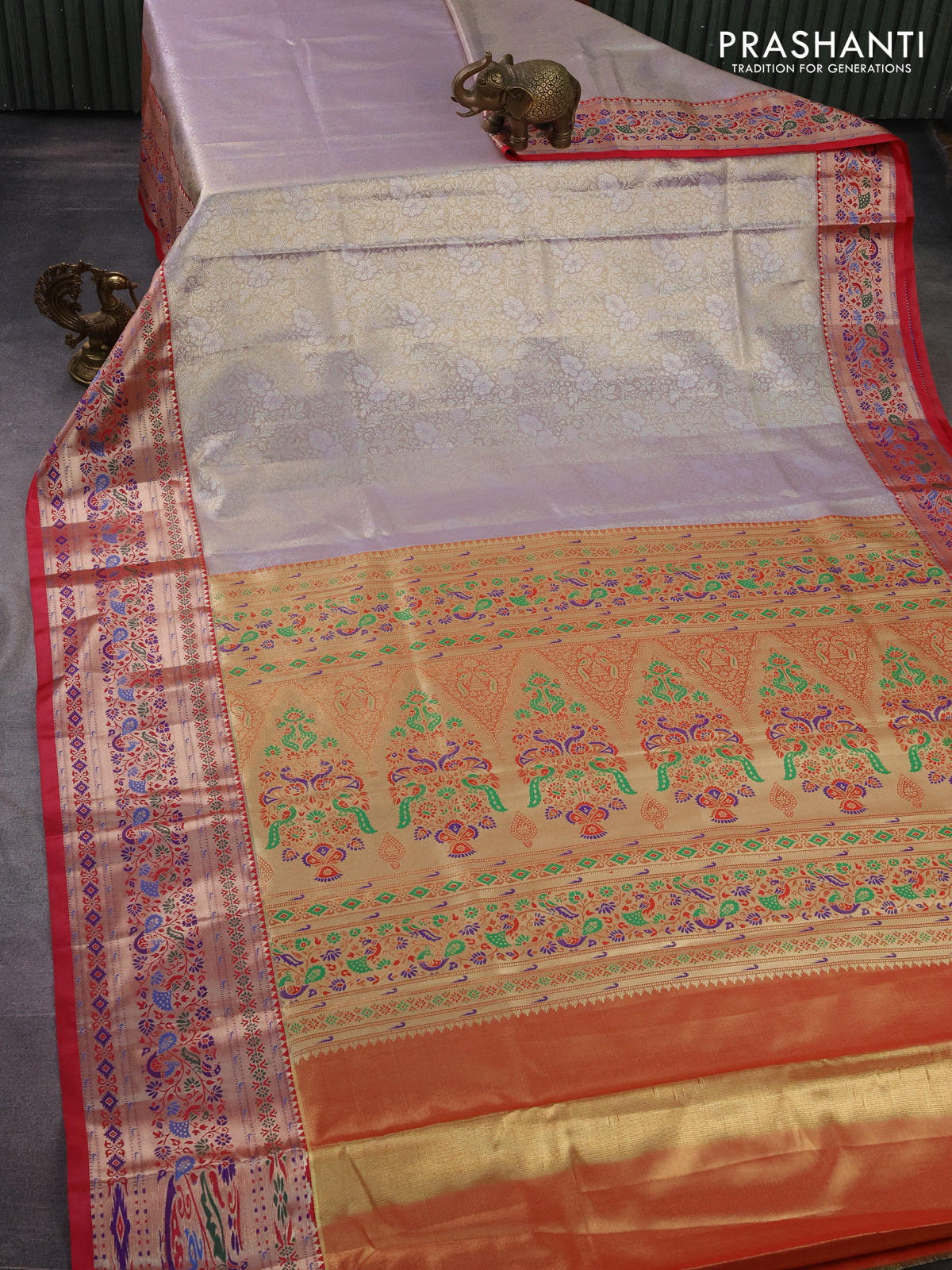 Tissue paithani silk saree mild lavender and reddish pink with allover silver zari woven brocade weaves and zari woven paithani style border