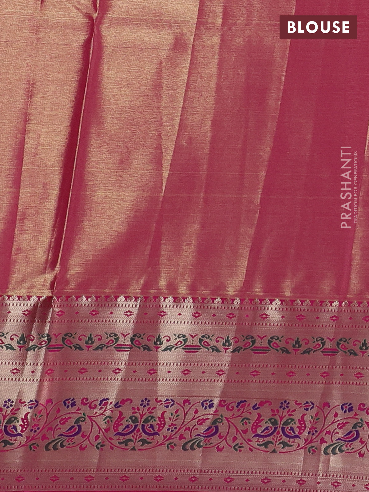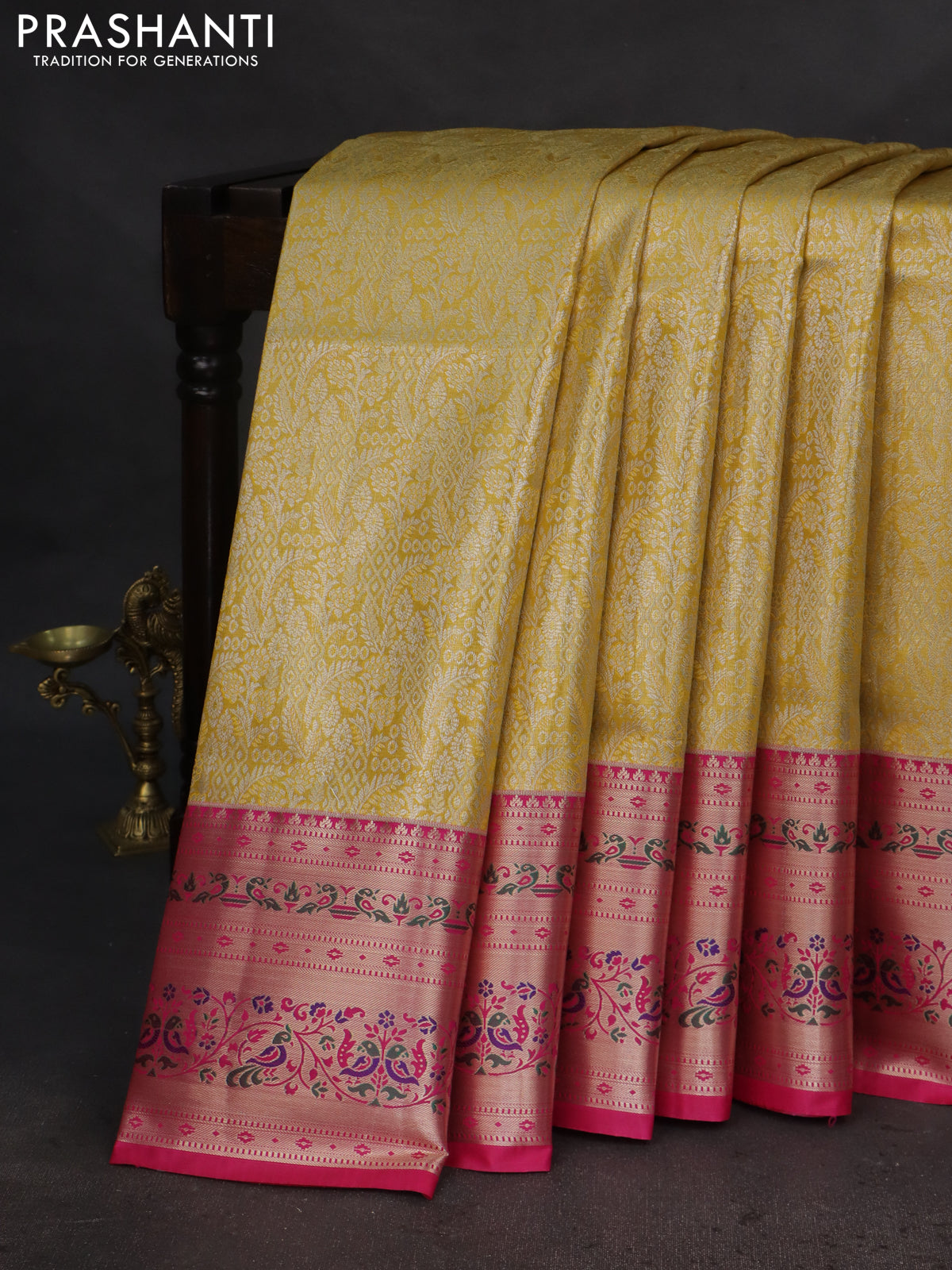 Tissue paithani silk saree mustard yellow and pink with allover silver zari woven brocade weaves and zari woven paithani style border