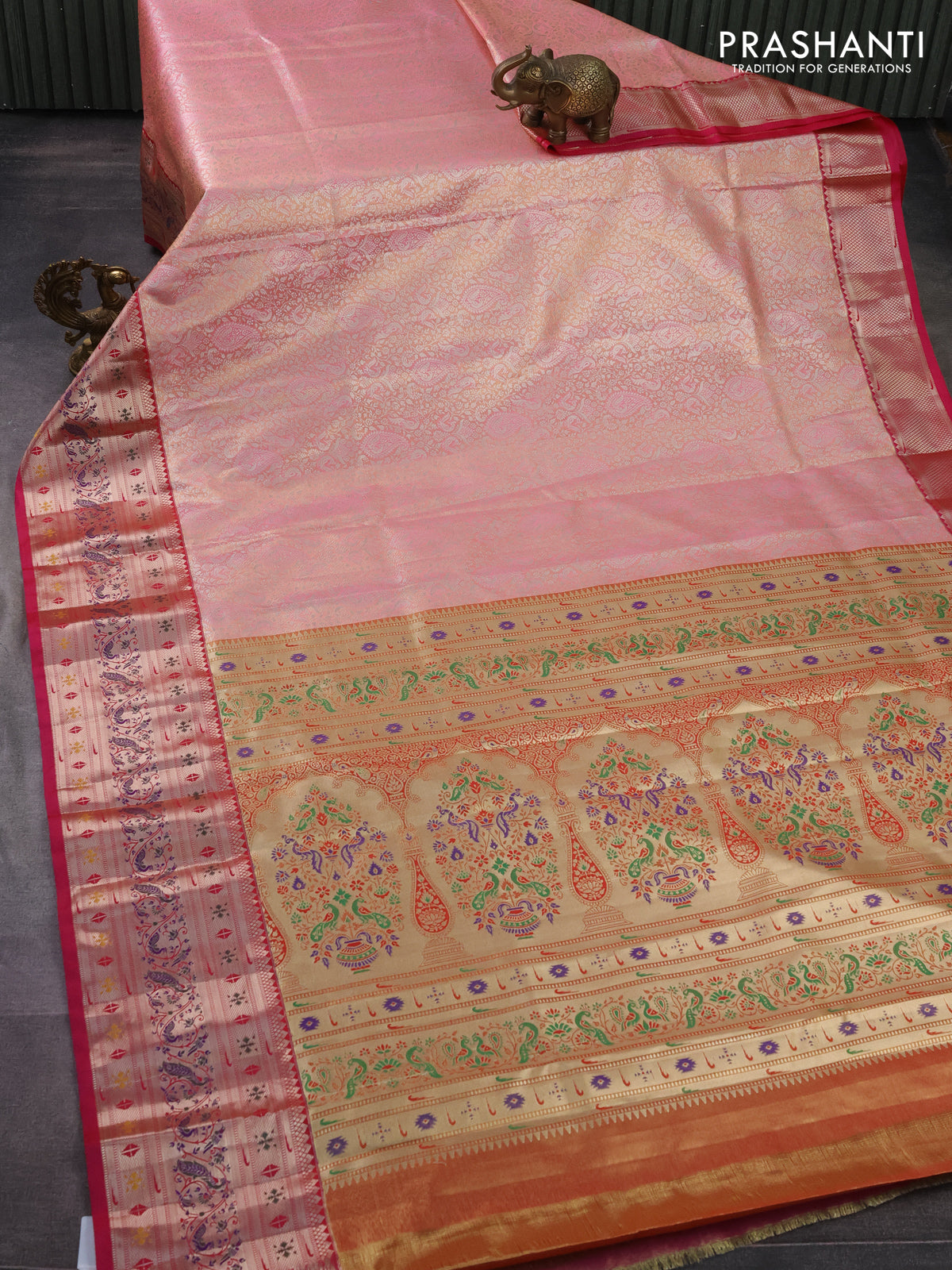 Tissue paithani silk saree peach pink and pink with allover silver zari woven brocade weaves and long zari woven paithani style border