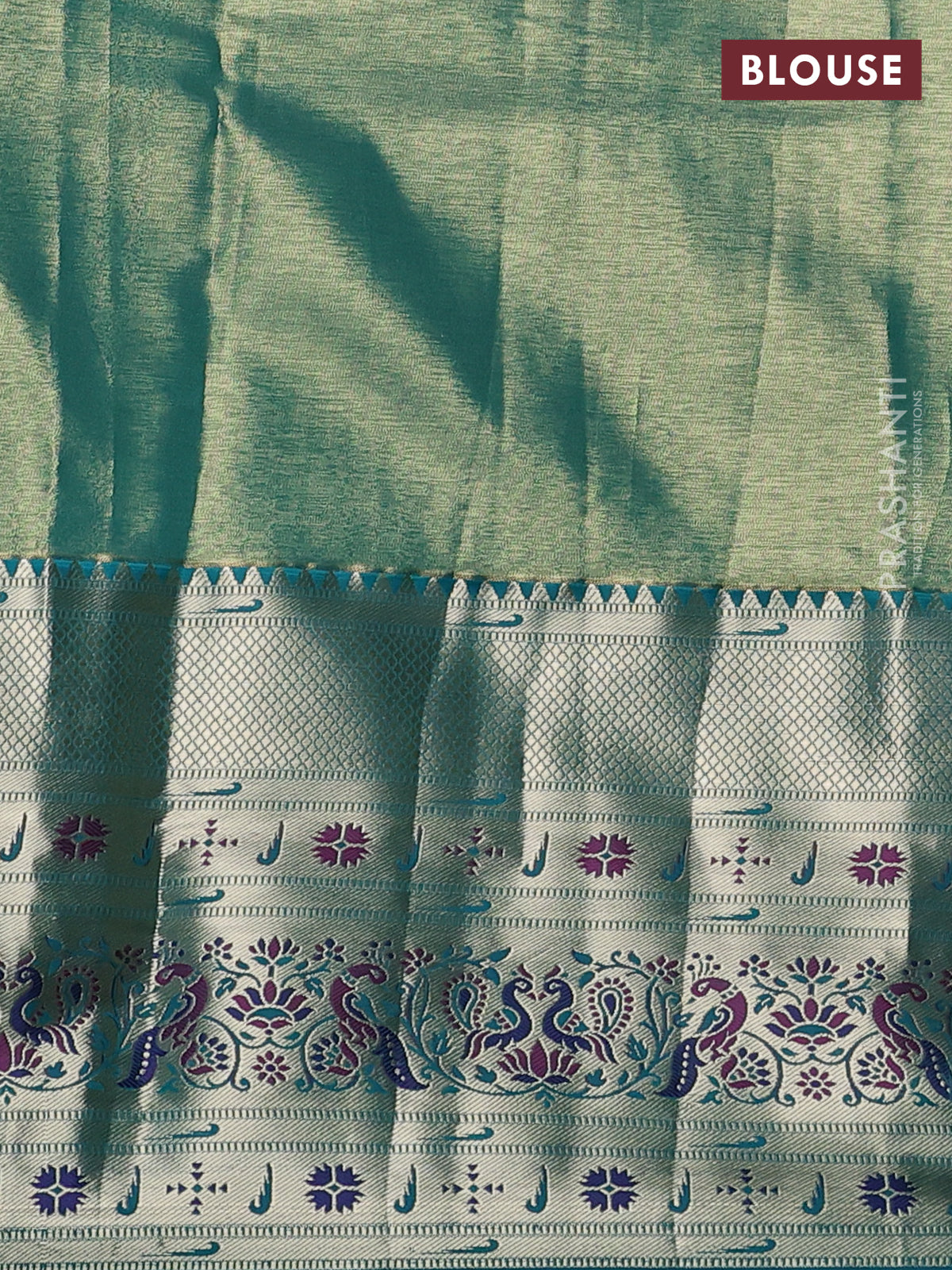 Tissue paithani silk saree peach shade and teal green with allover silver zari woven brocade weaves and long zari woven paithani style border