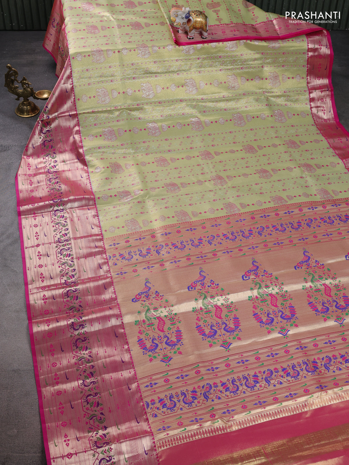 Tissue paithani silk saree pista green and pink with allover zari woven brocade weaves and long zari woven paithani style border