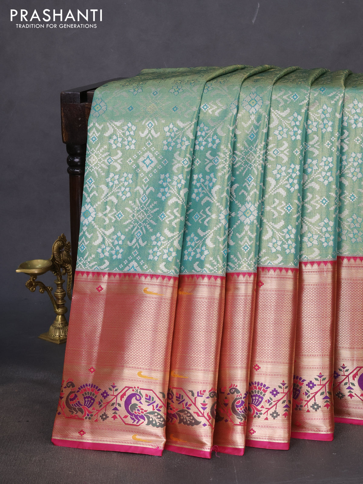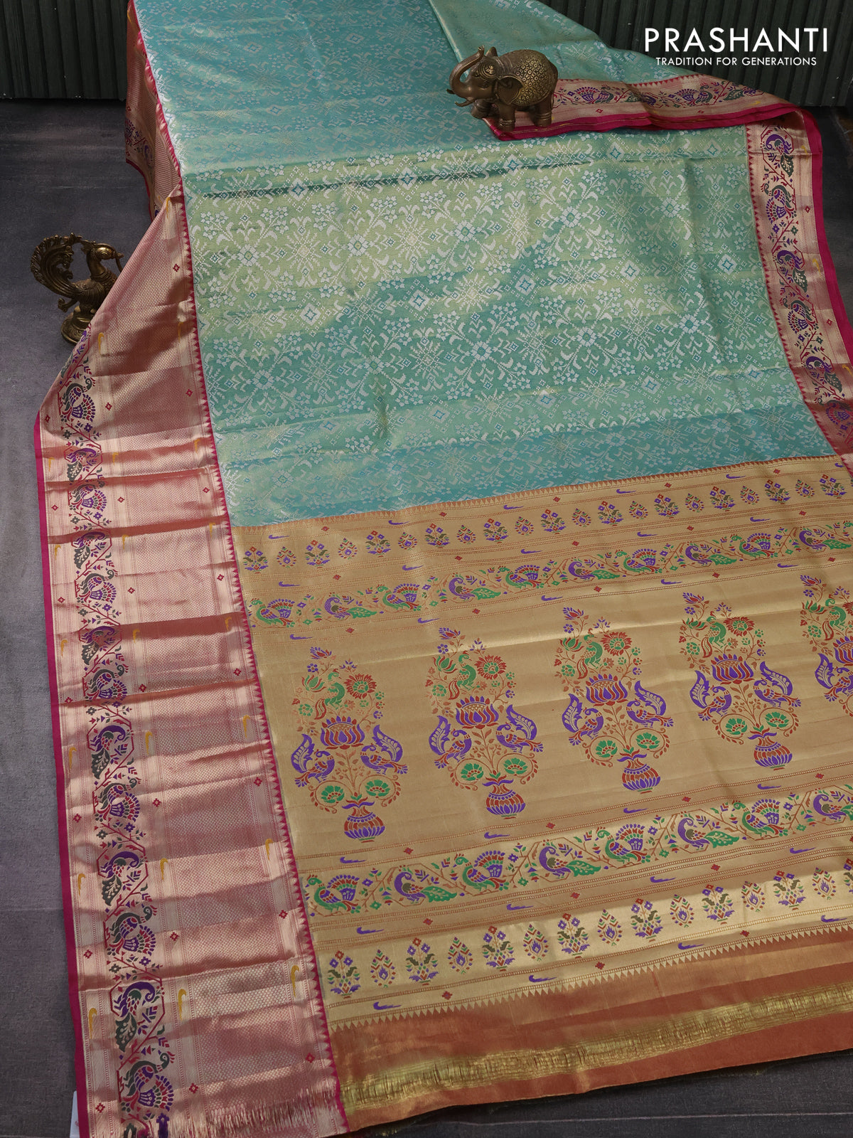 Tissue paithani silk saree teal green and magenta pink with allover silver zari woven brocade weaves and long zari woven paithani style border