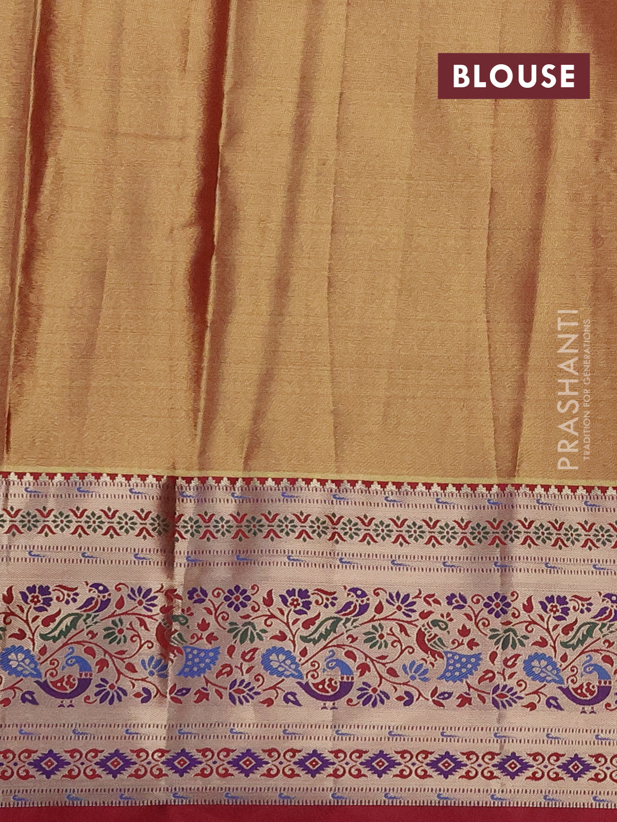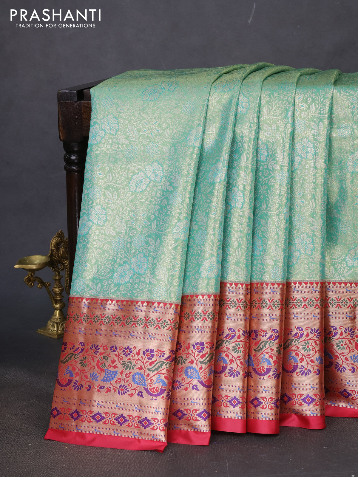 Tissue paithani silk saree teal green and reddish pink with allover silver zari woven brocade weaves and zari woven paithani style border