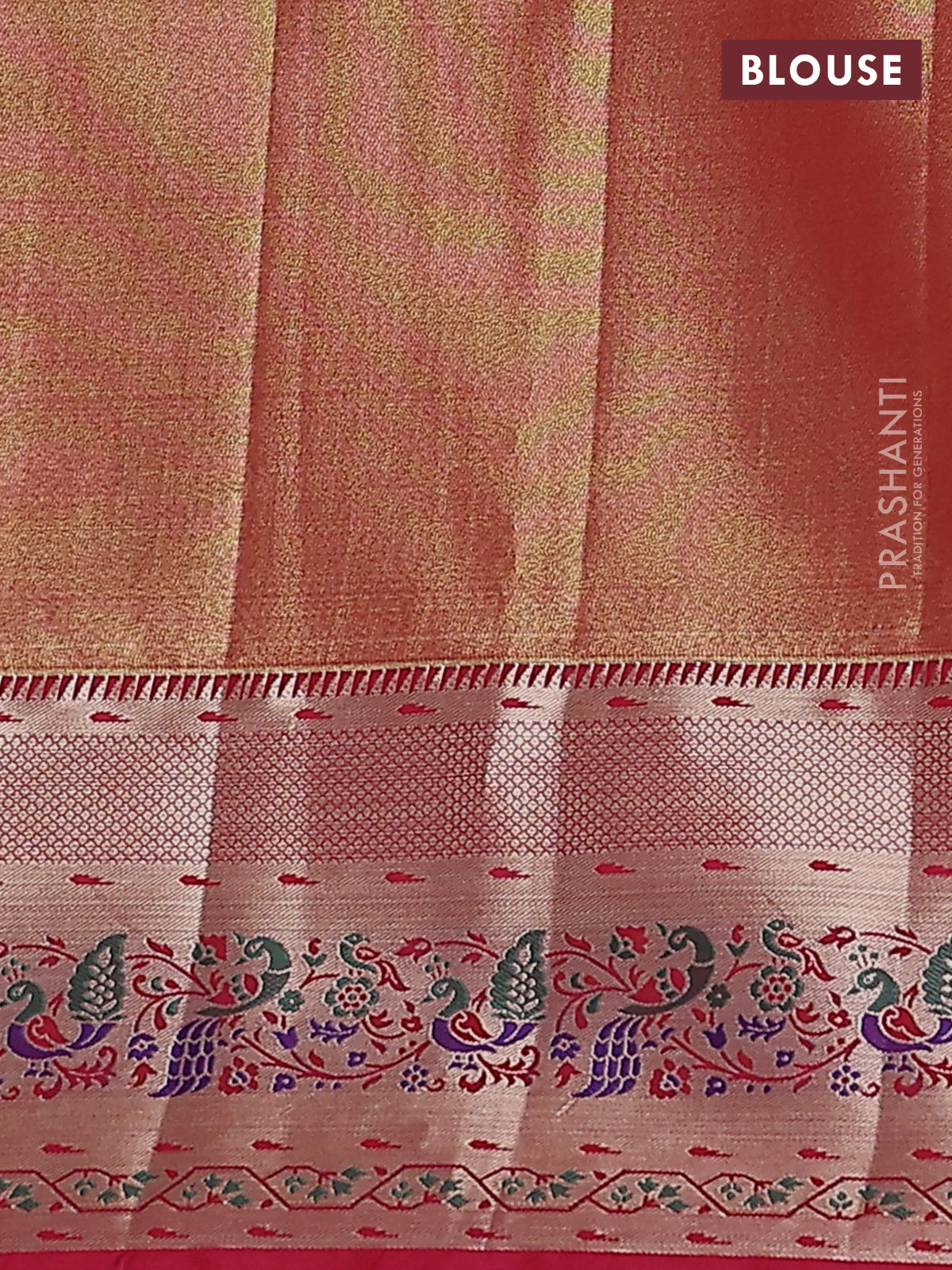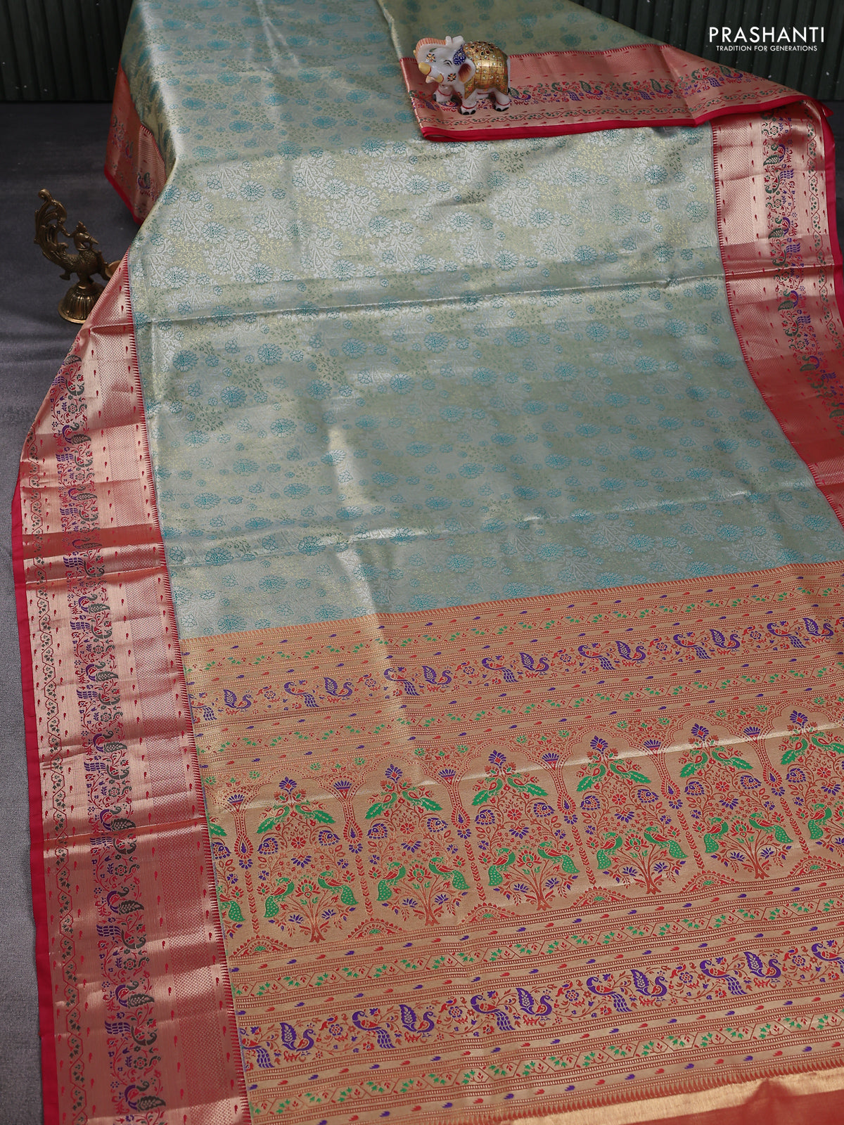 Tissue paithani silk saree teal green shade and red with allover zari woven brocade weaves and zari woven paithani style border