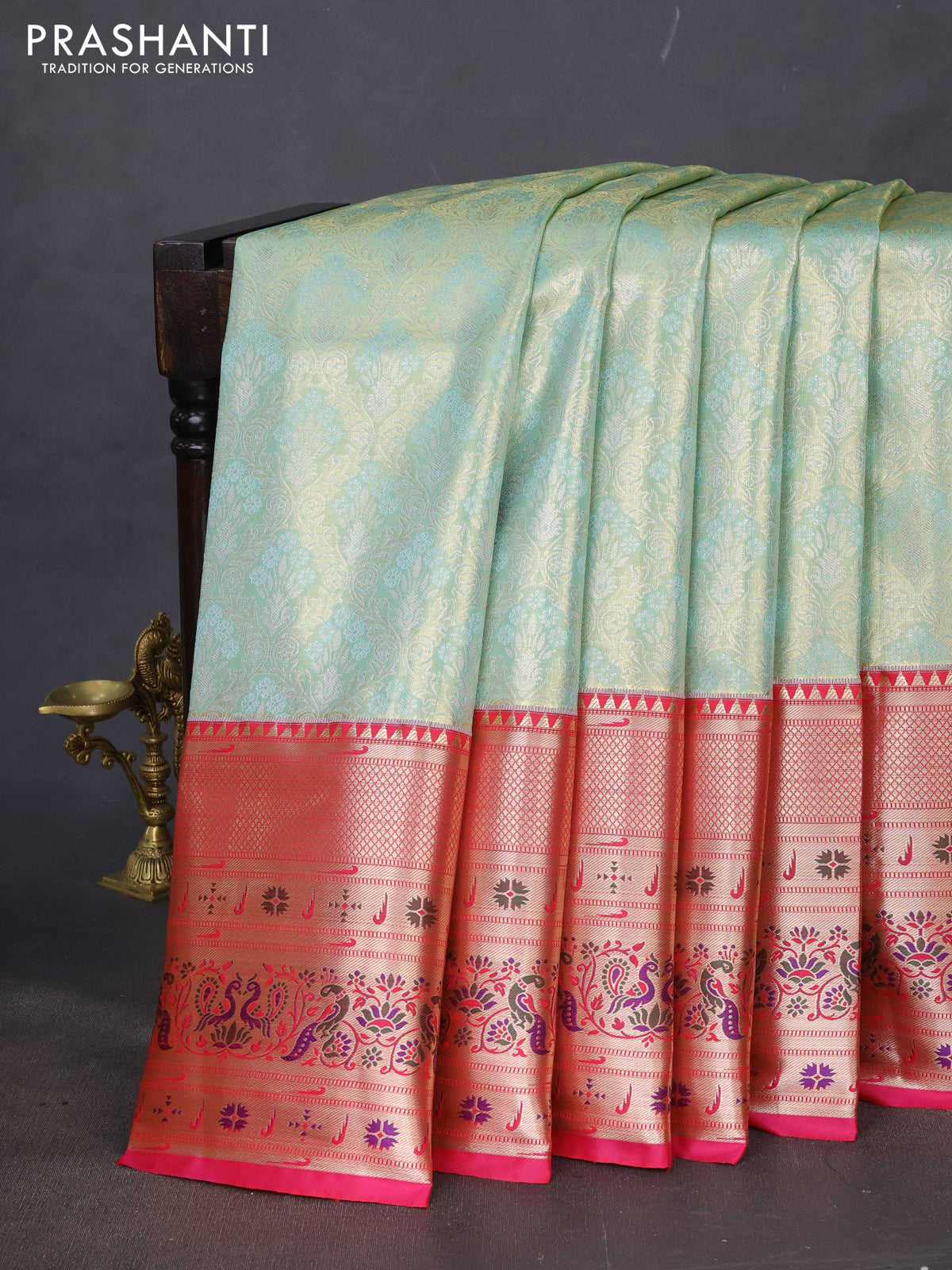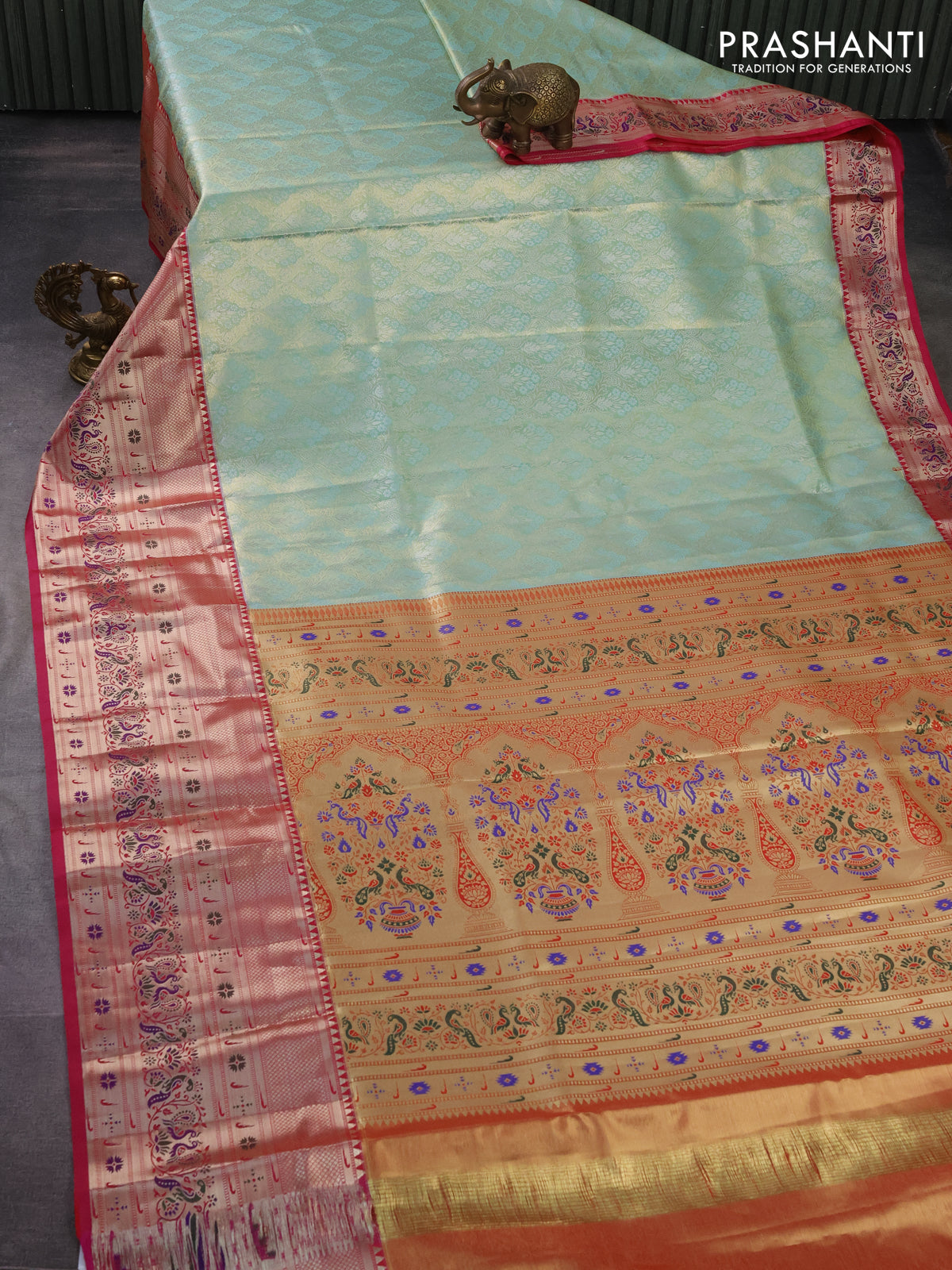 Tissue paithani silk saree teal shade and pink with allover silver zari woven brocade weaves and zari woven paithani style border