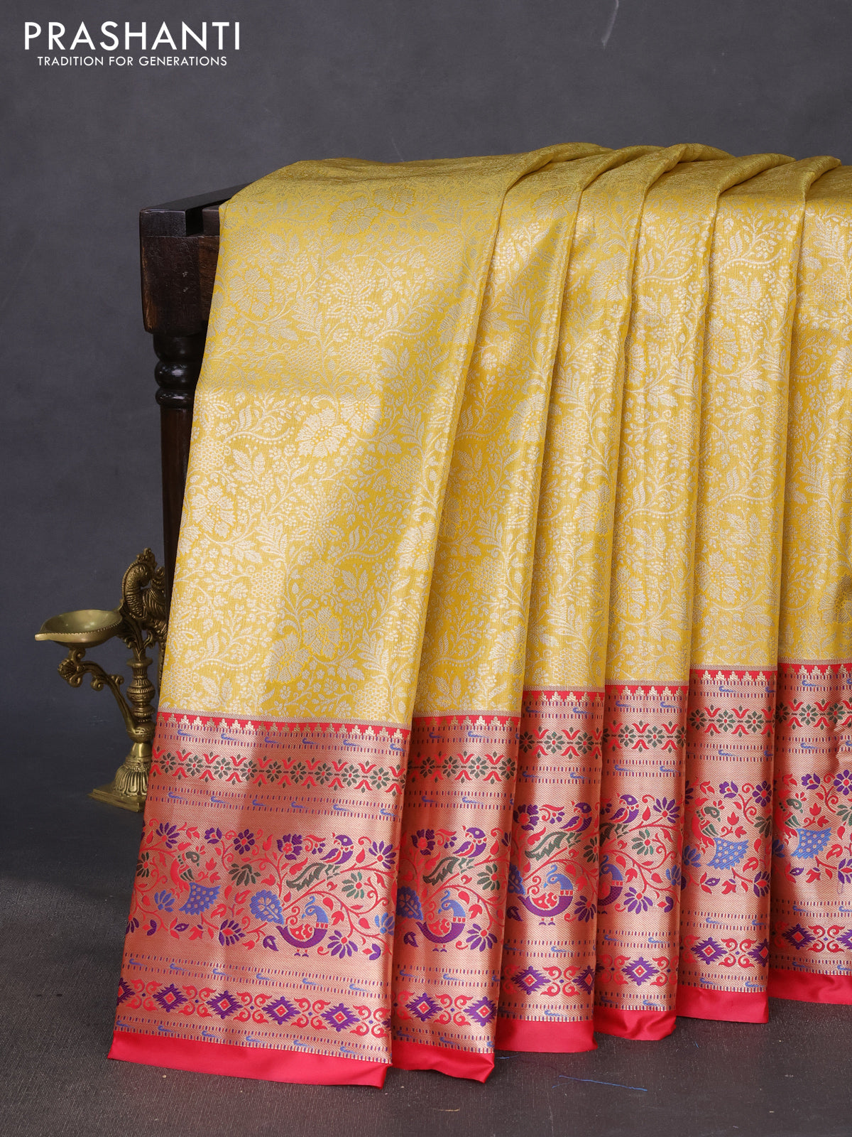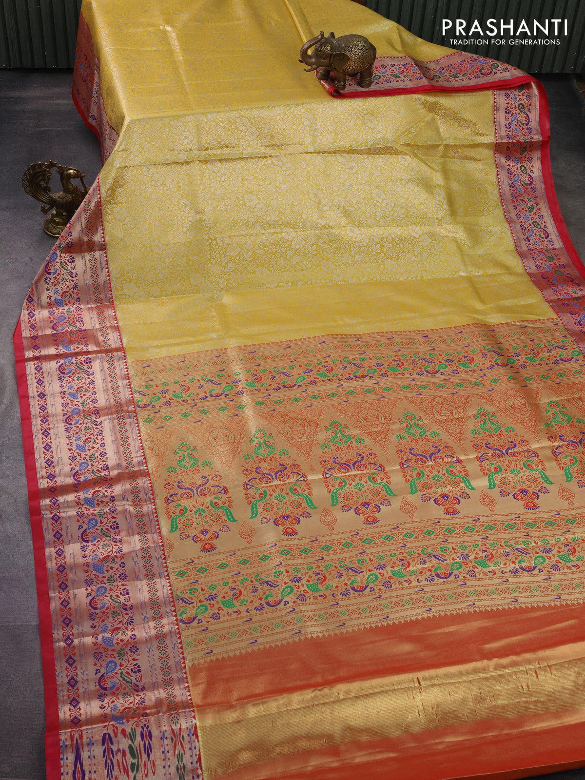 Tissue paithani silk saree yellow and red with allover silver zari woven brocade weaves and zari woven paithani style border