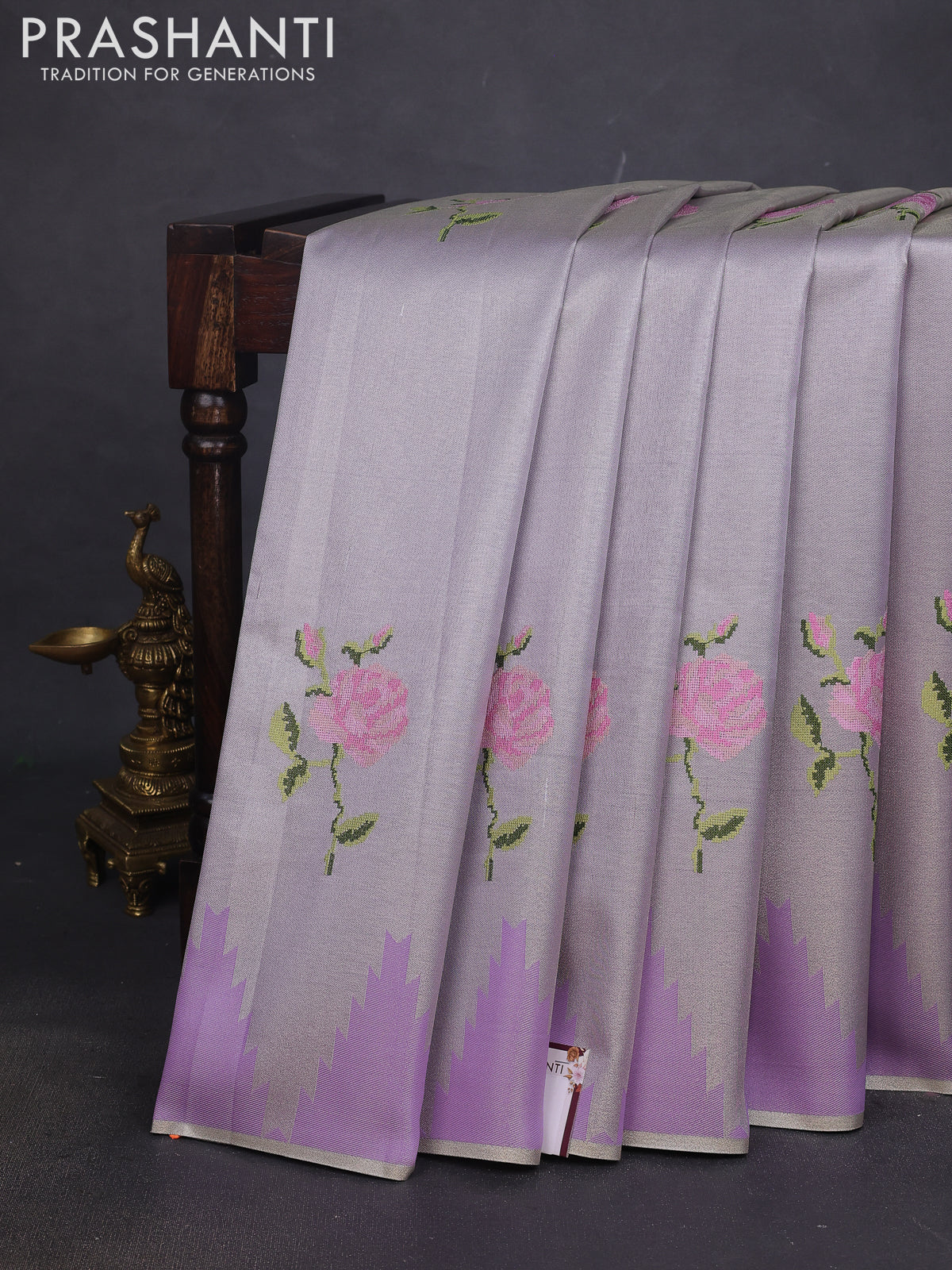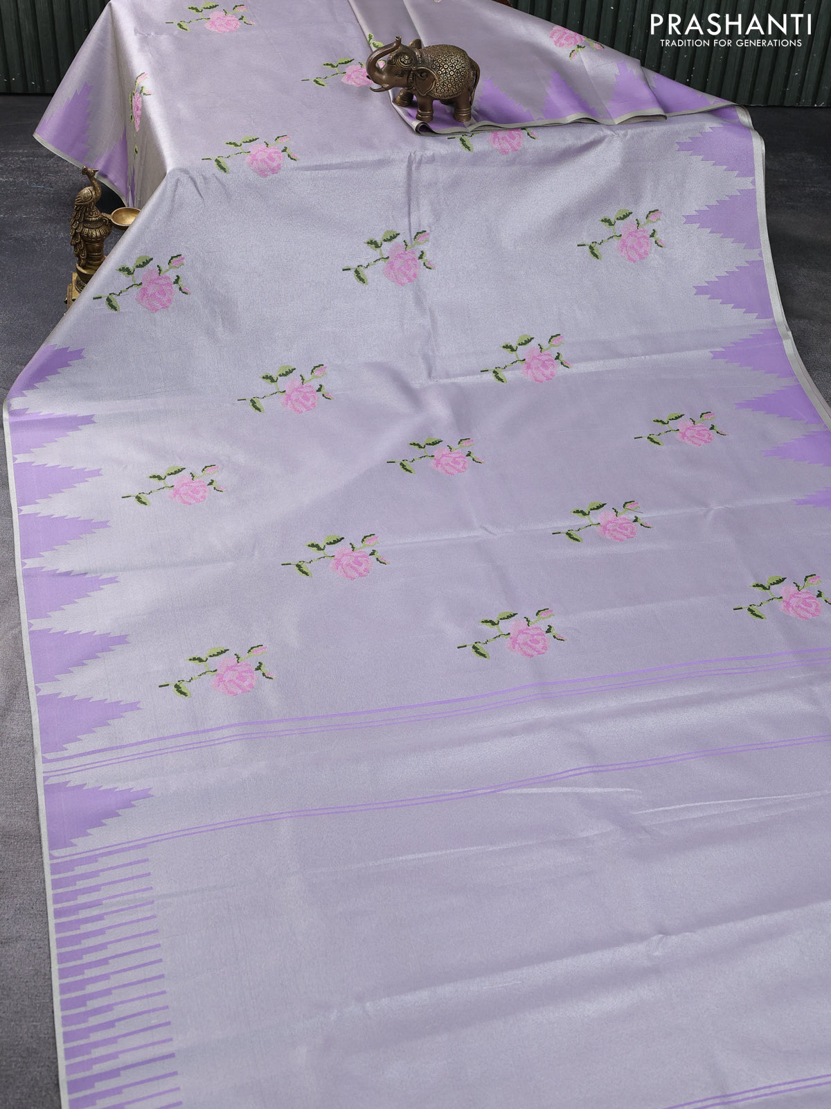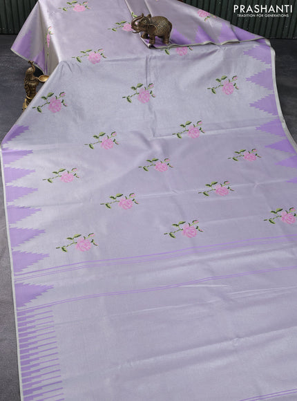 Tissue saree lavender shade with embroidery work buttas and temple design zari border