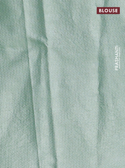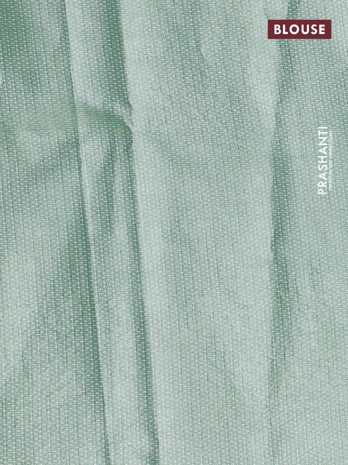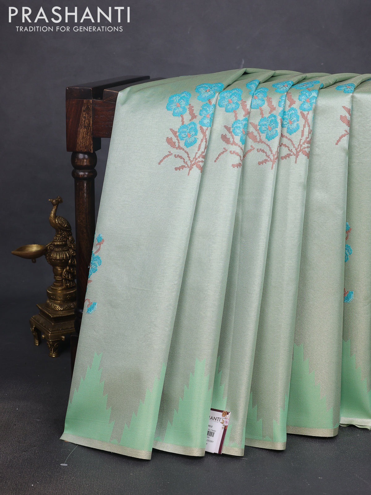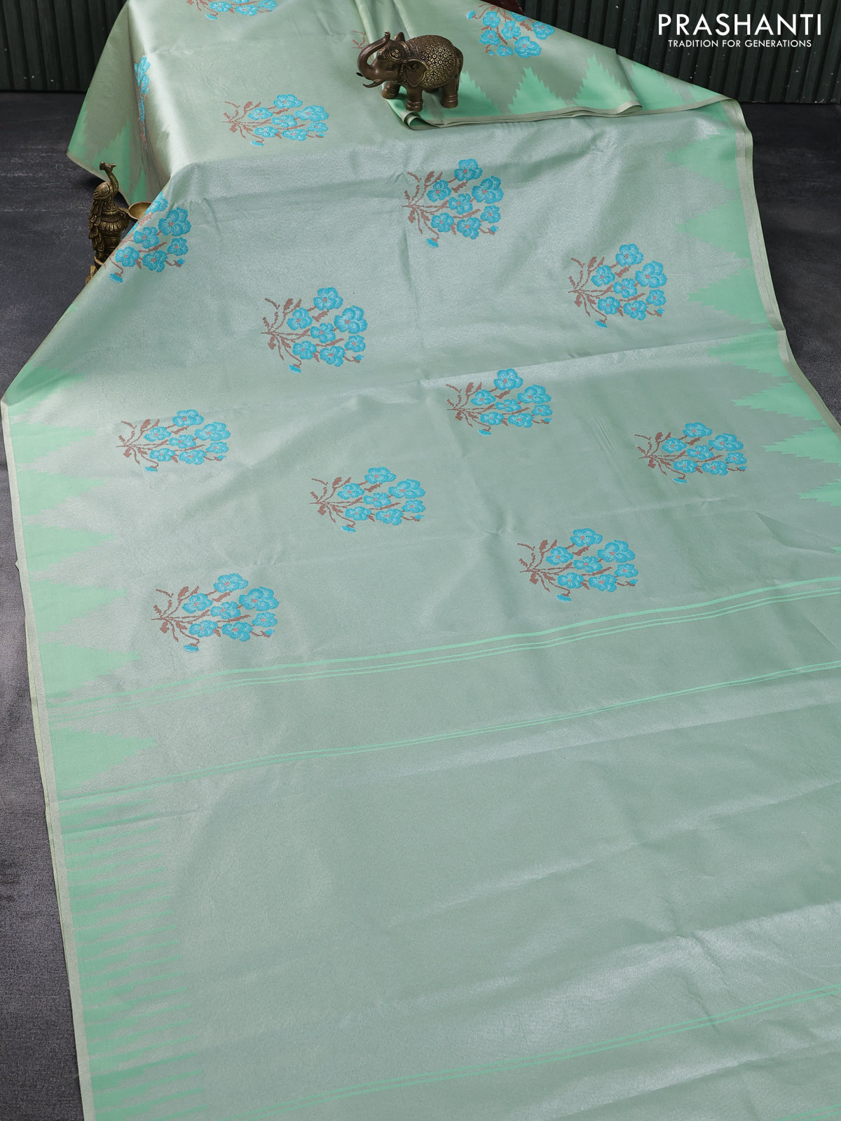 Tissue saree pastel green with embroidery work buttas and temple design zari border