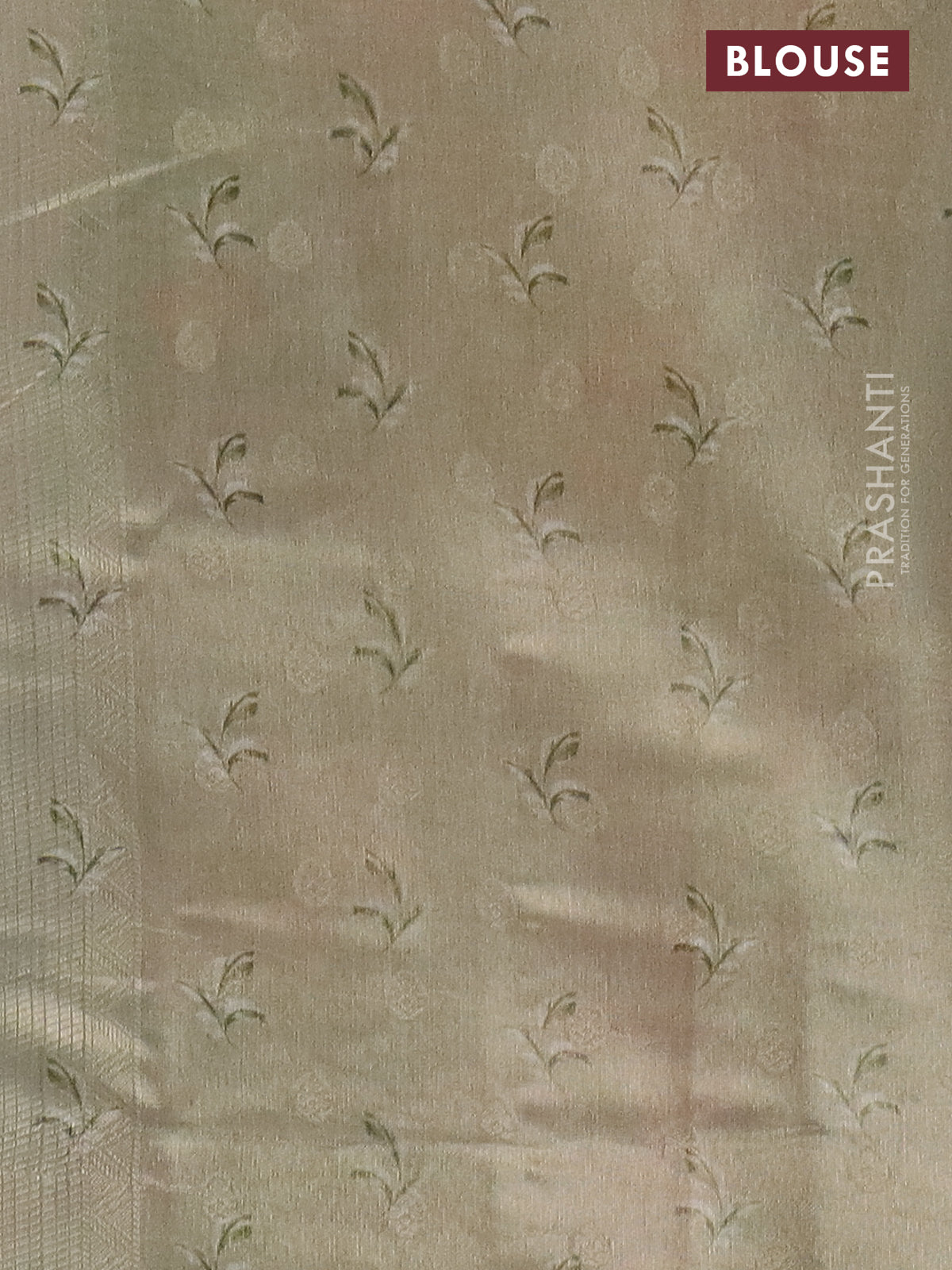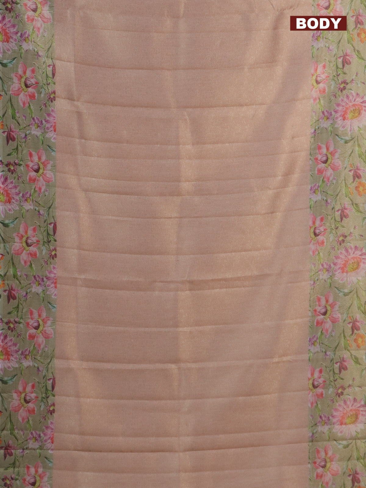 Tissue saree pastel peach and green with allover zari weaves and floral digital printed border