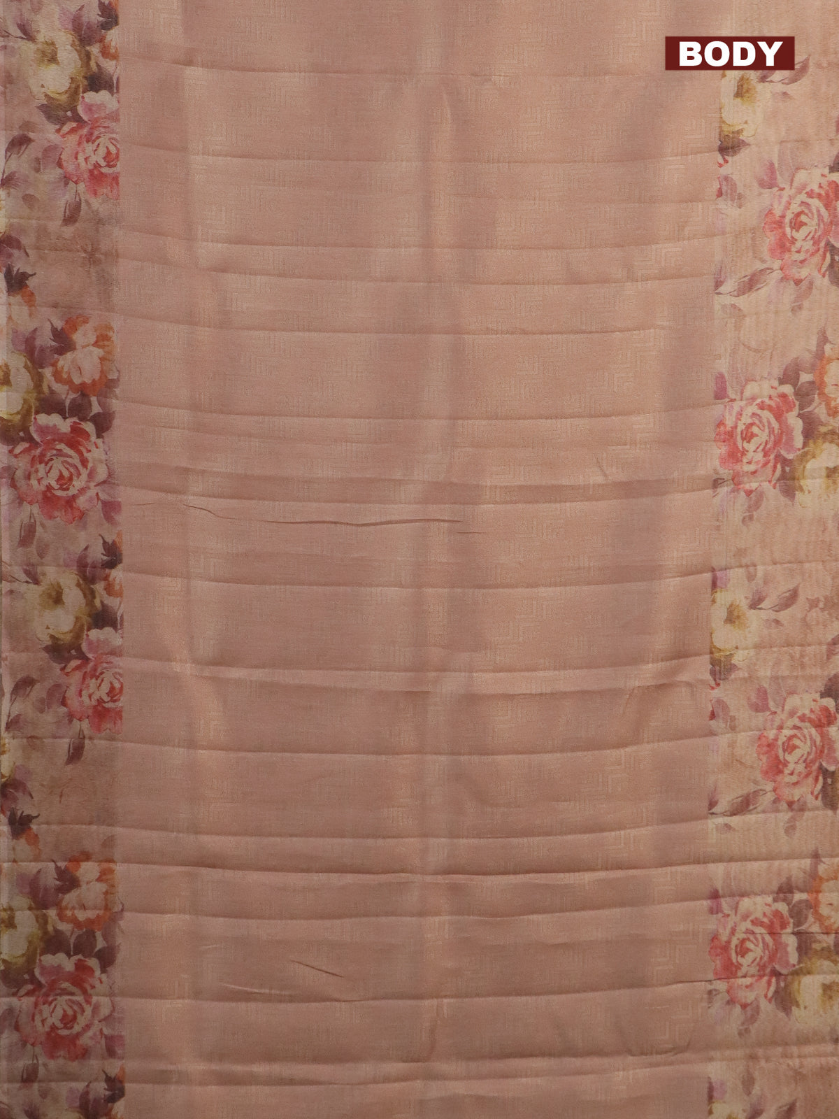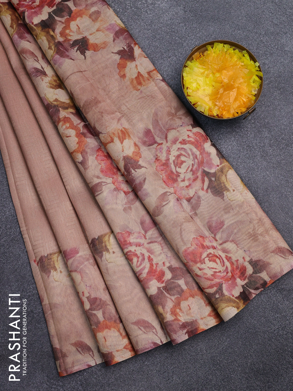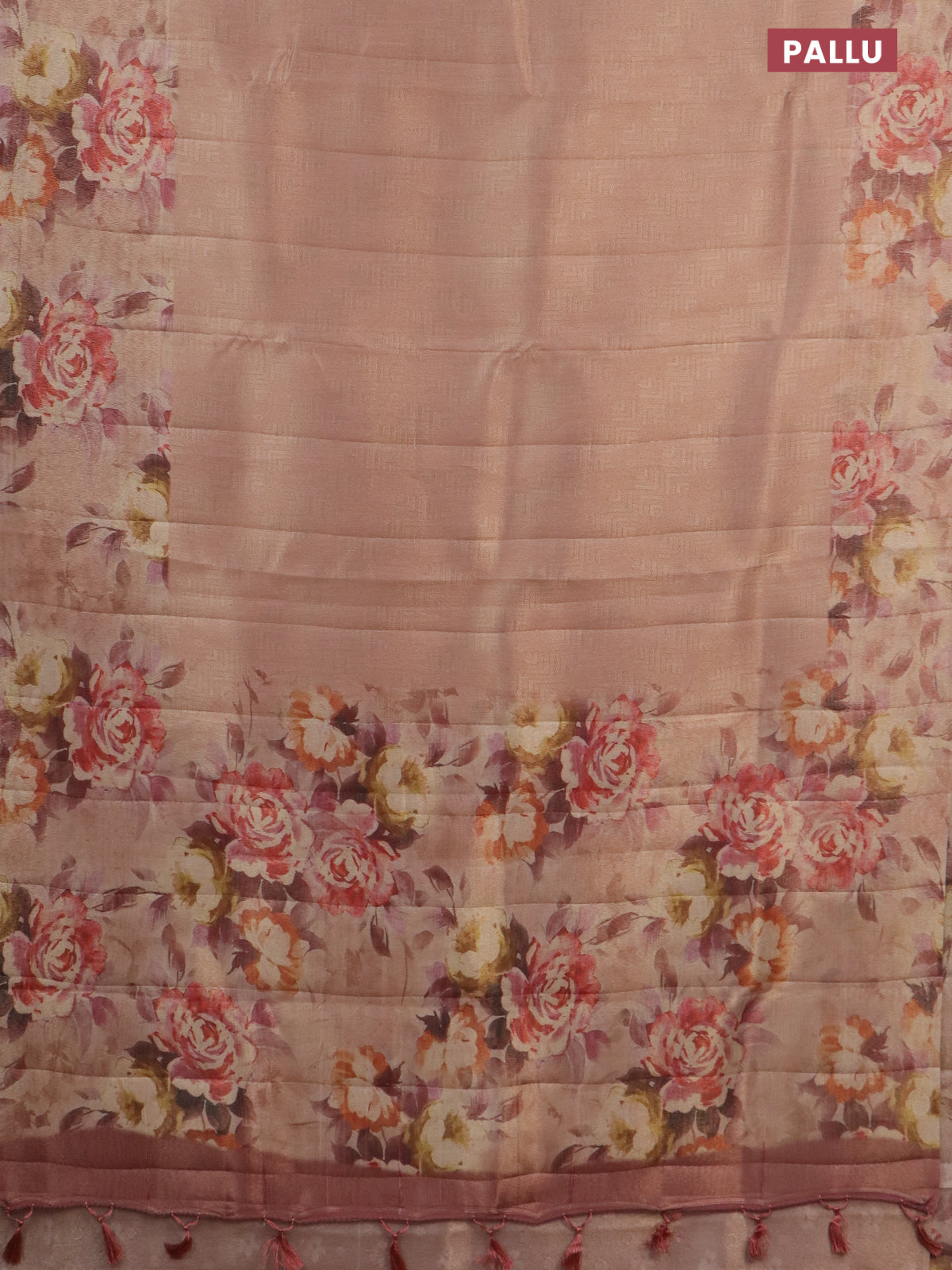 Tissue saree pastel peach with allover zari weaves and floral digital printed border