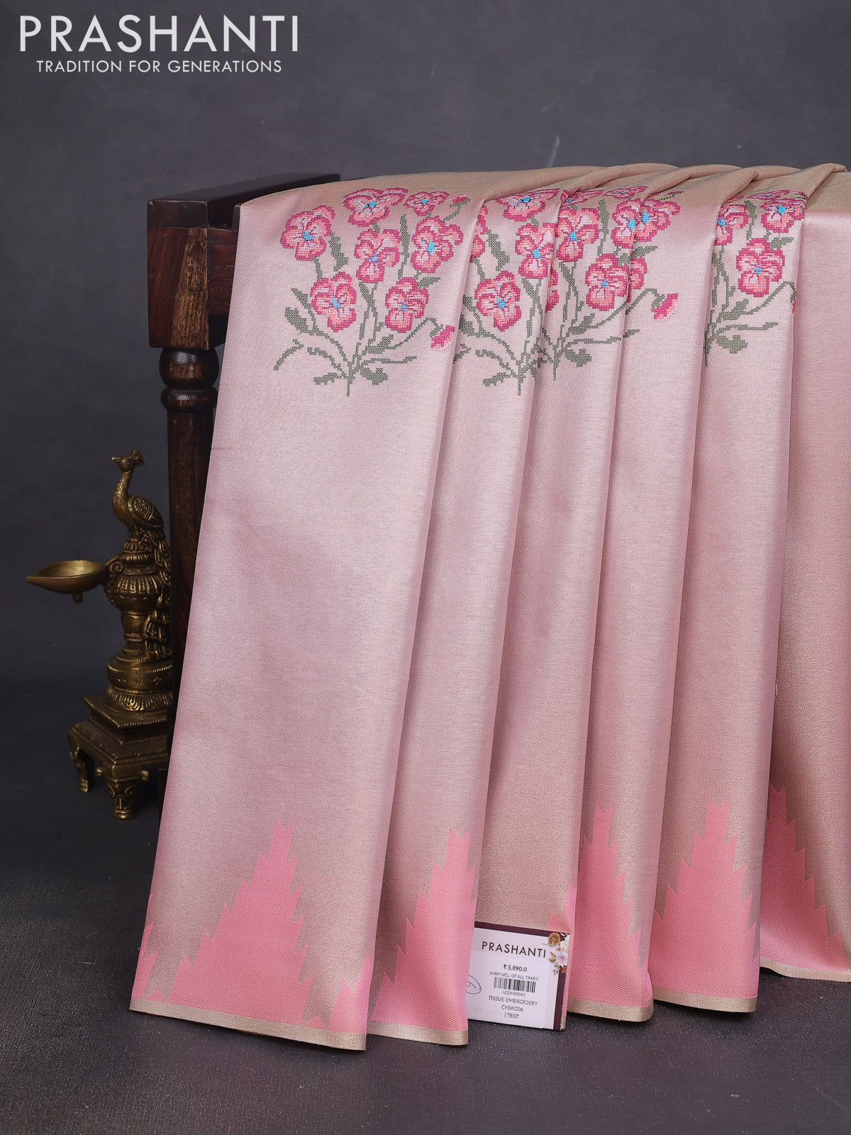 Tissue saree pastel pink with embroidery work buttas and temple design zari border