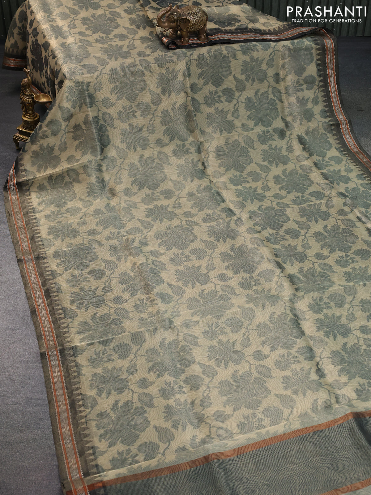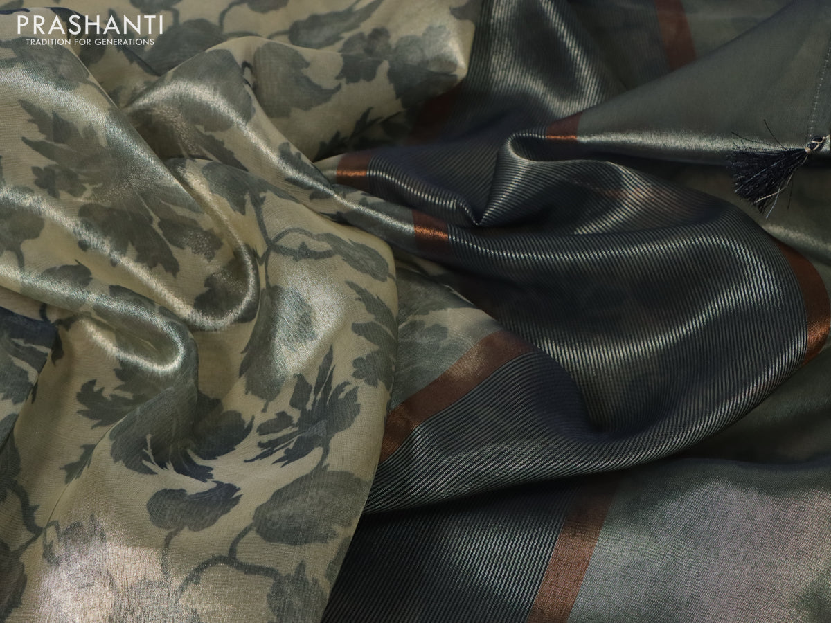Tissue saree sandal and grey with allover floral digital prints and temple design zari woven border