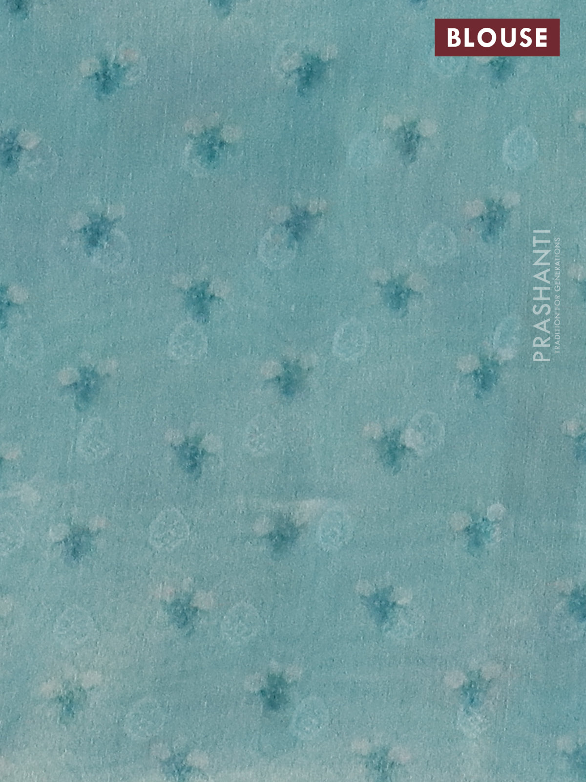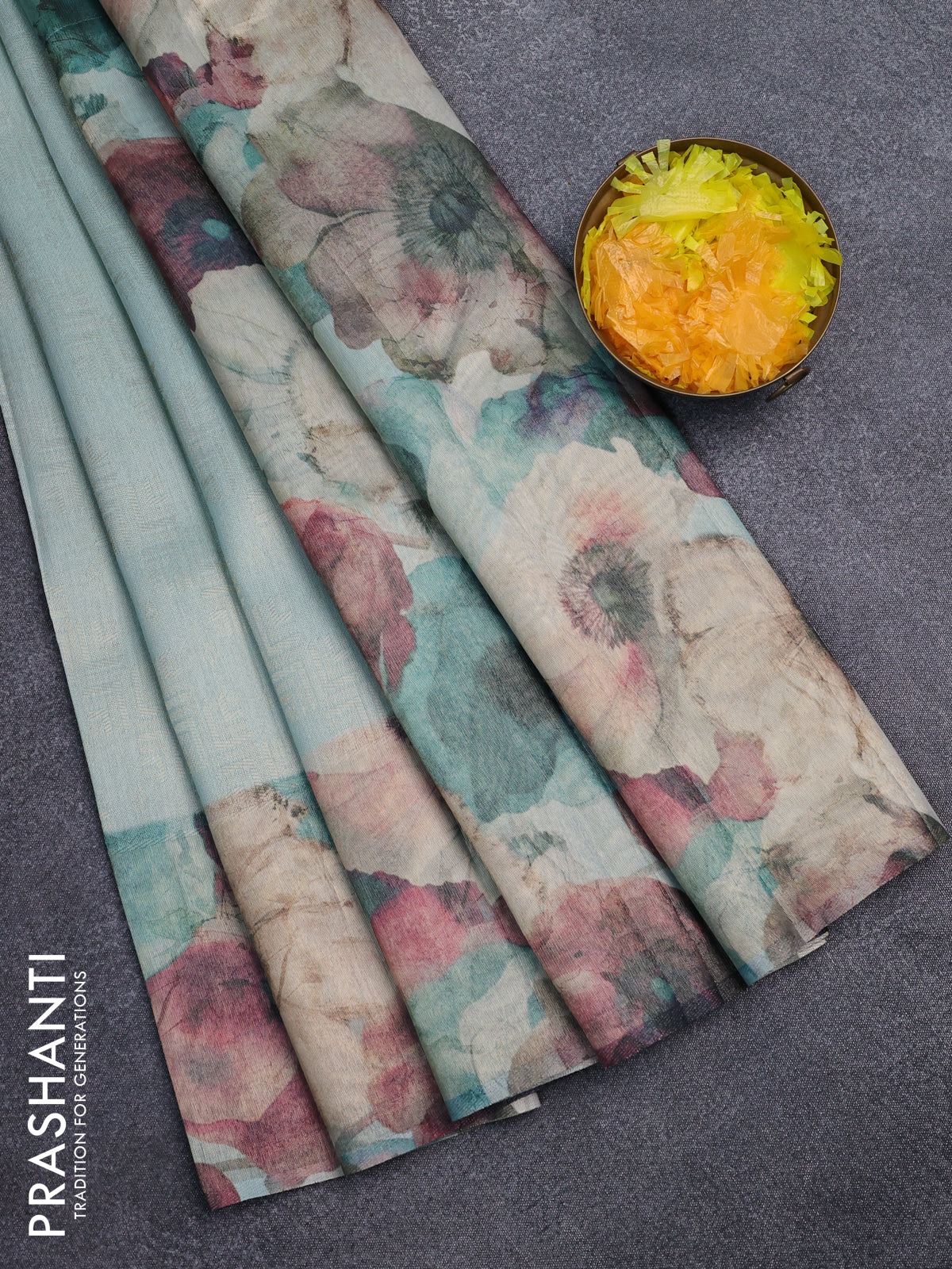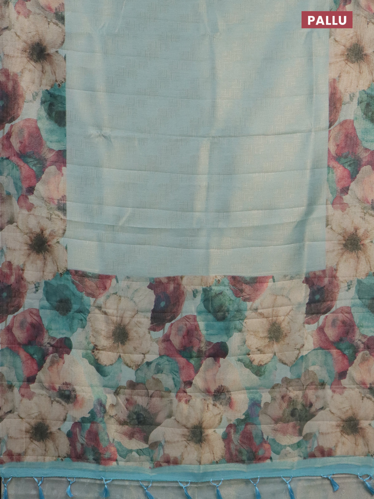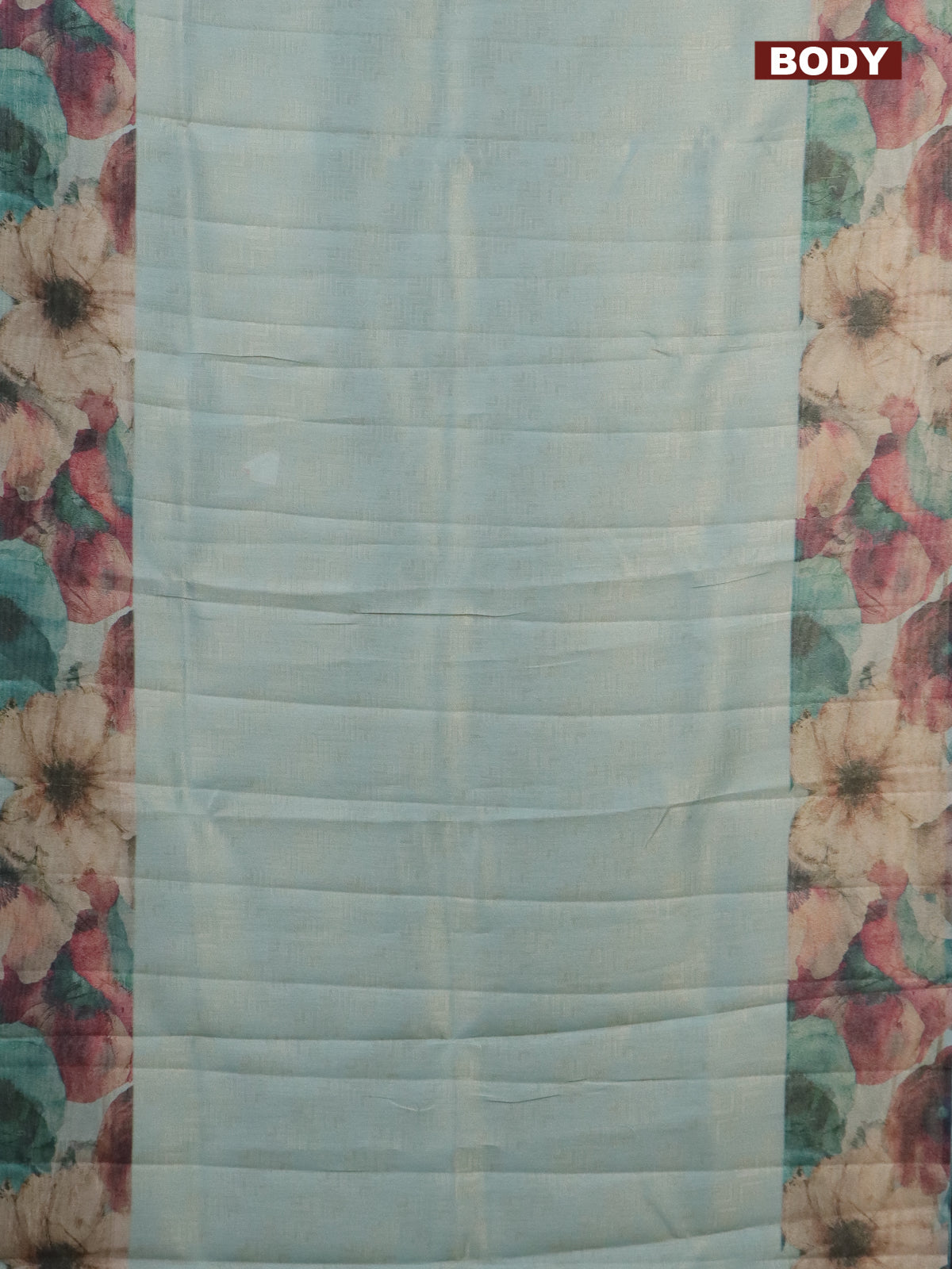Tissue saree teal blue with allover zari weaves and floral digital printed border