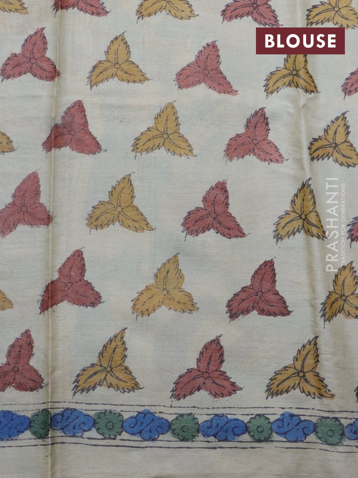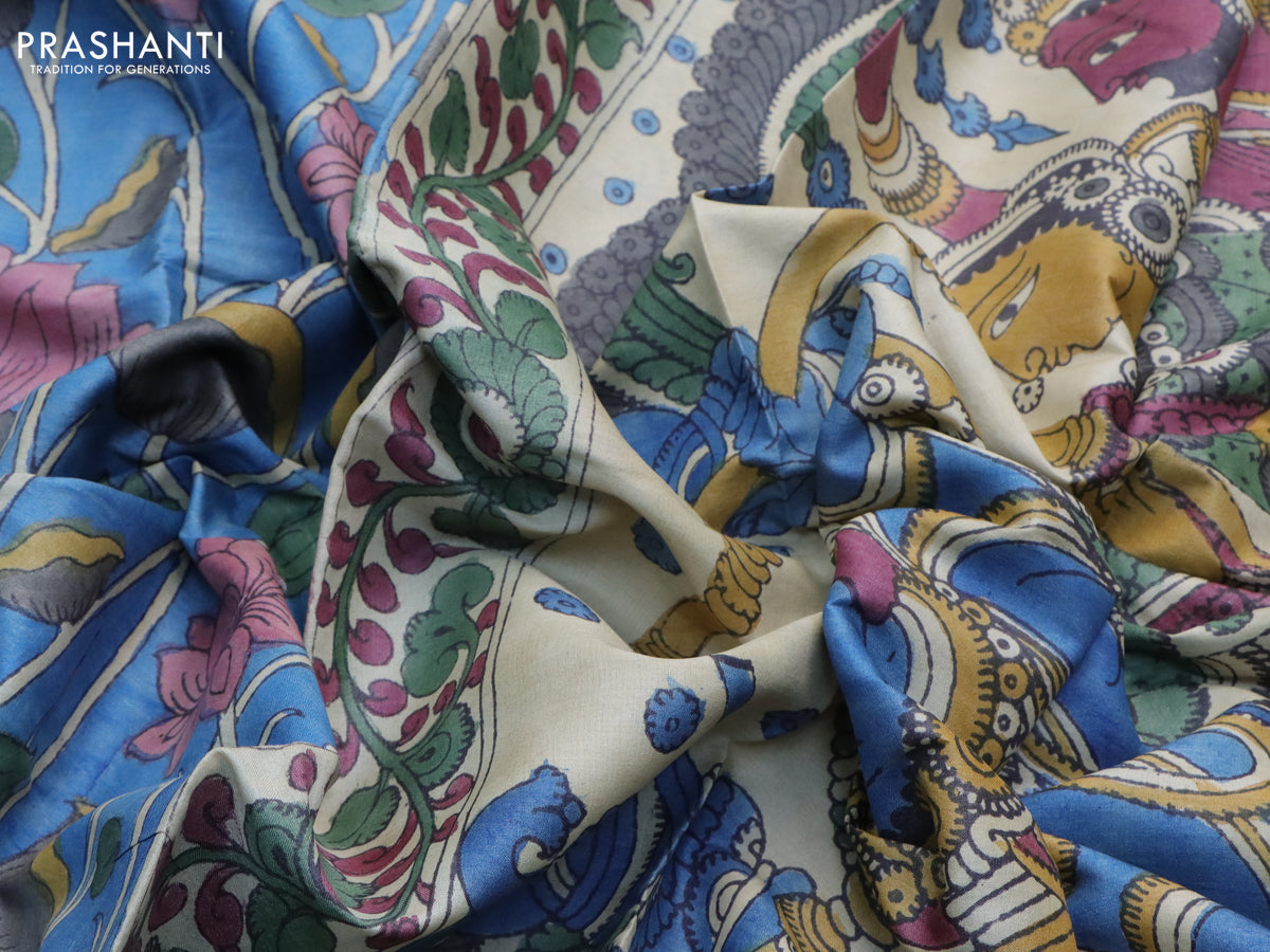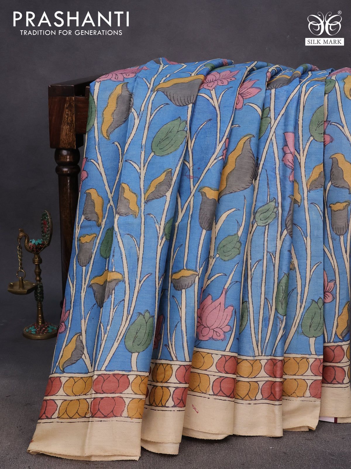 Tussar silk saree blue and beige with allover hand painted pen kalamkari prints and printed border