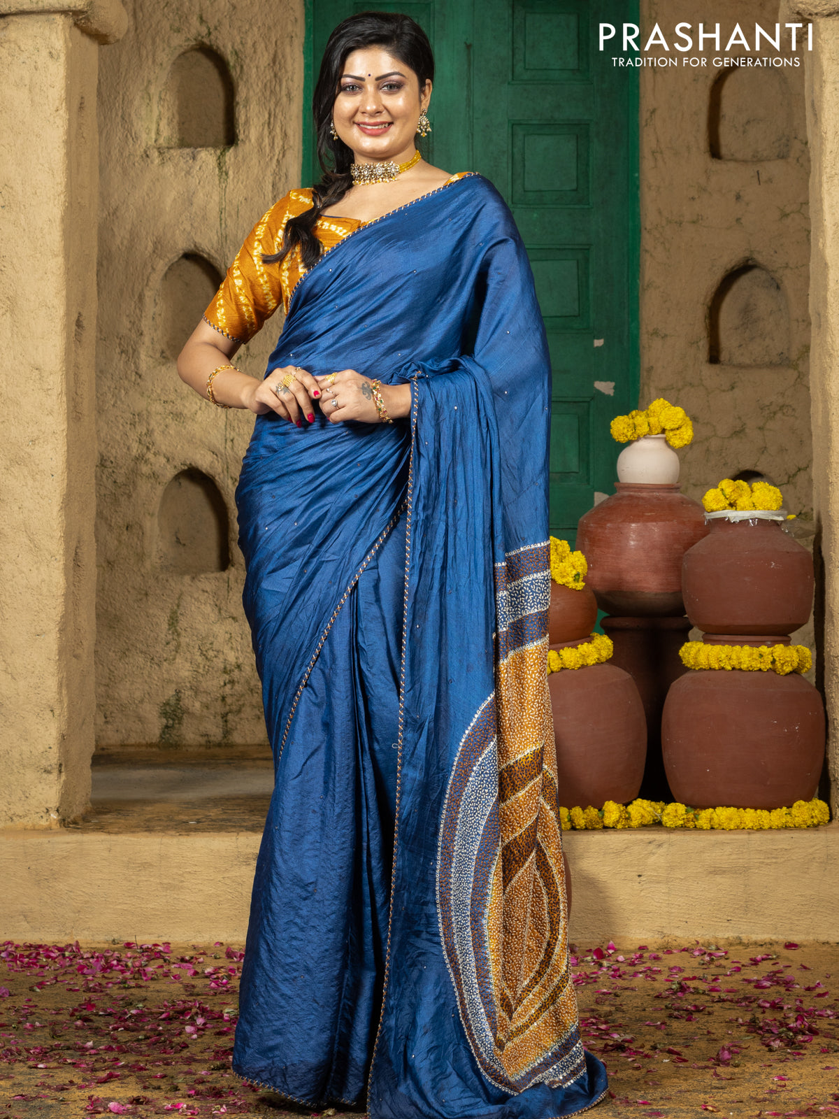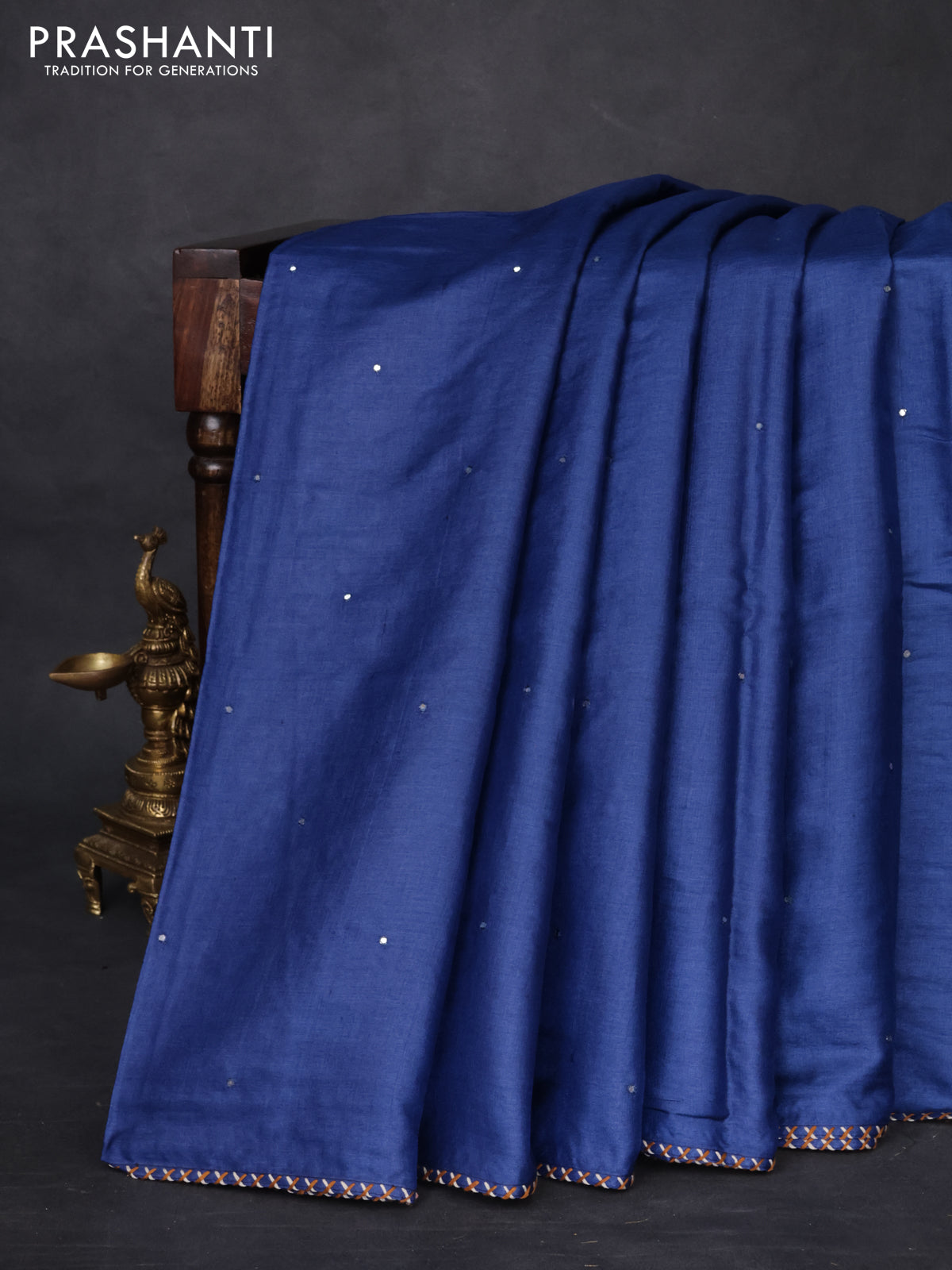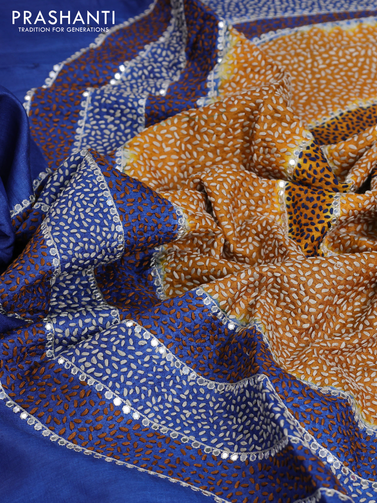 Tussar silk saree blue with centre placement style embroidery & mirror work and embroidery border