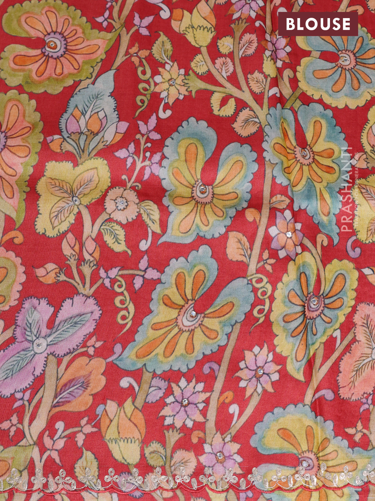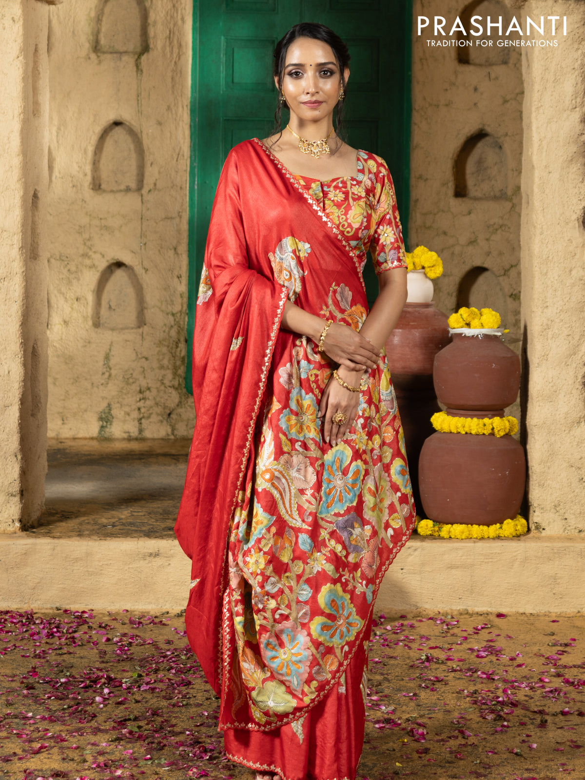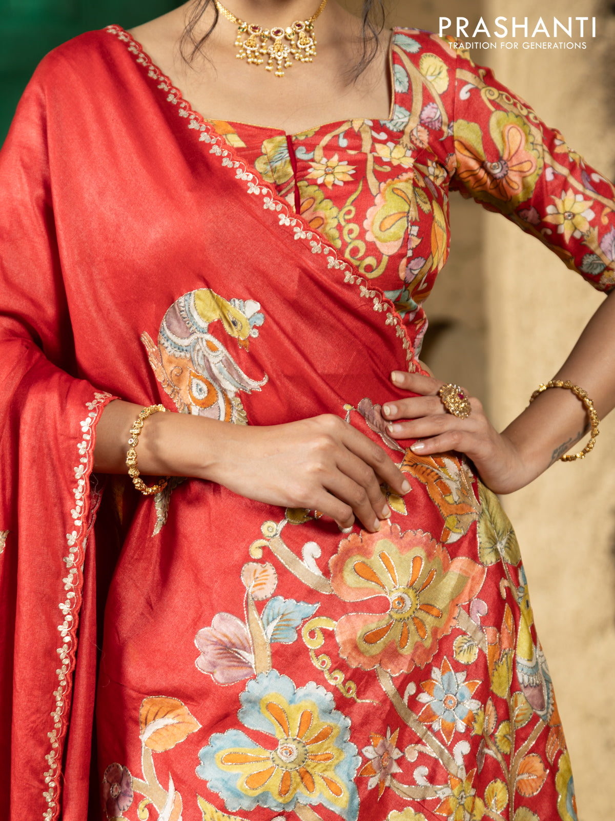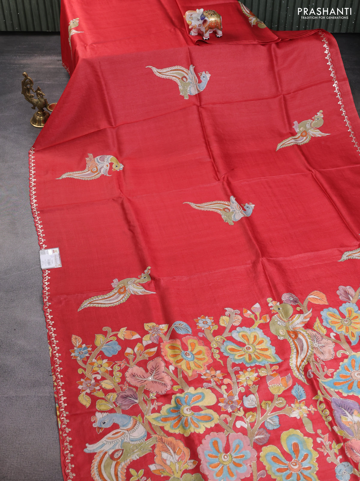 Tussar silk saree red with hand painted kalamkari prints & pita work and embroidery border