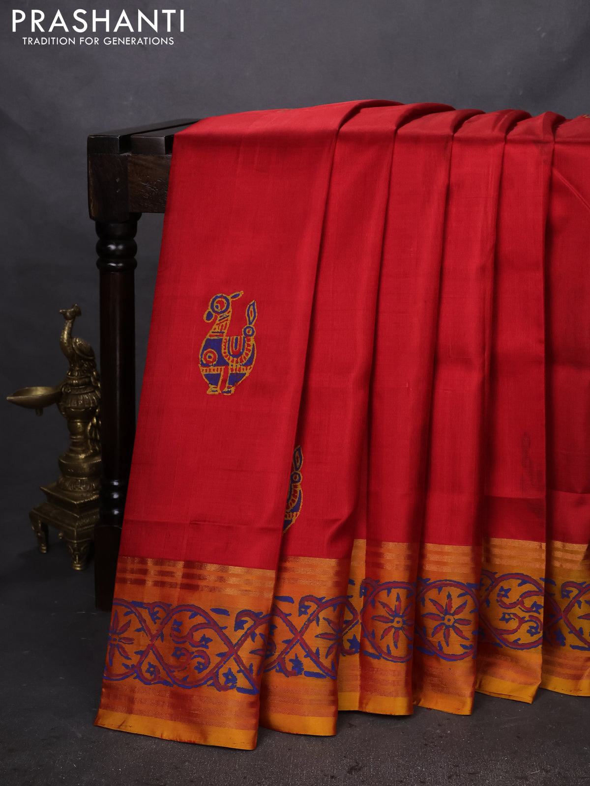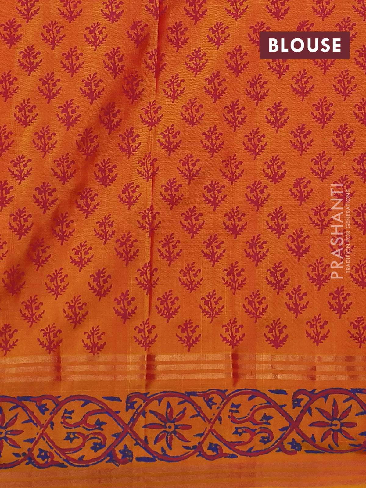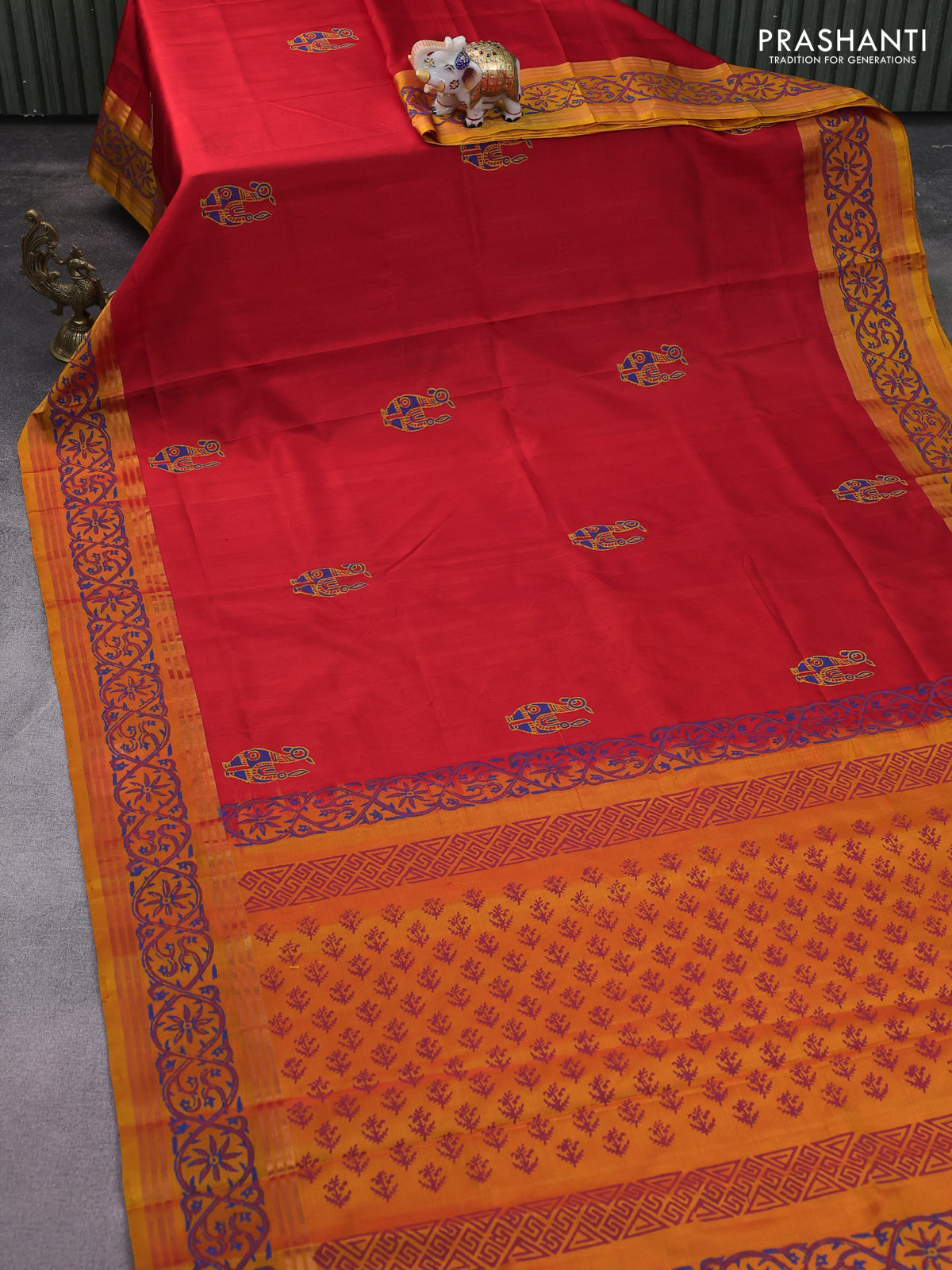 Uppada block printed silk saree red shade and dual shade of yellow with butta prints and zari woven printed border