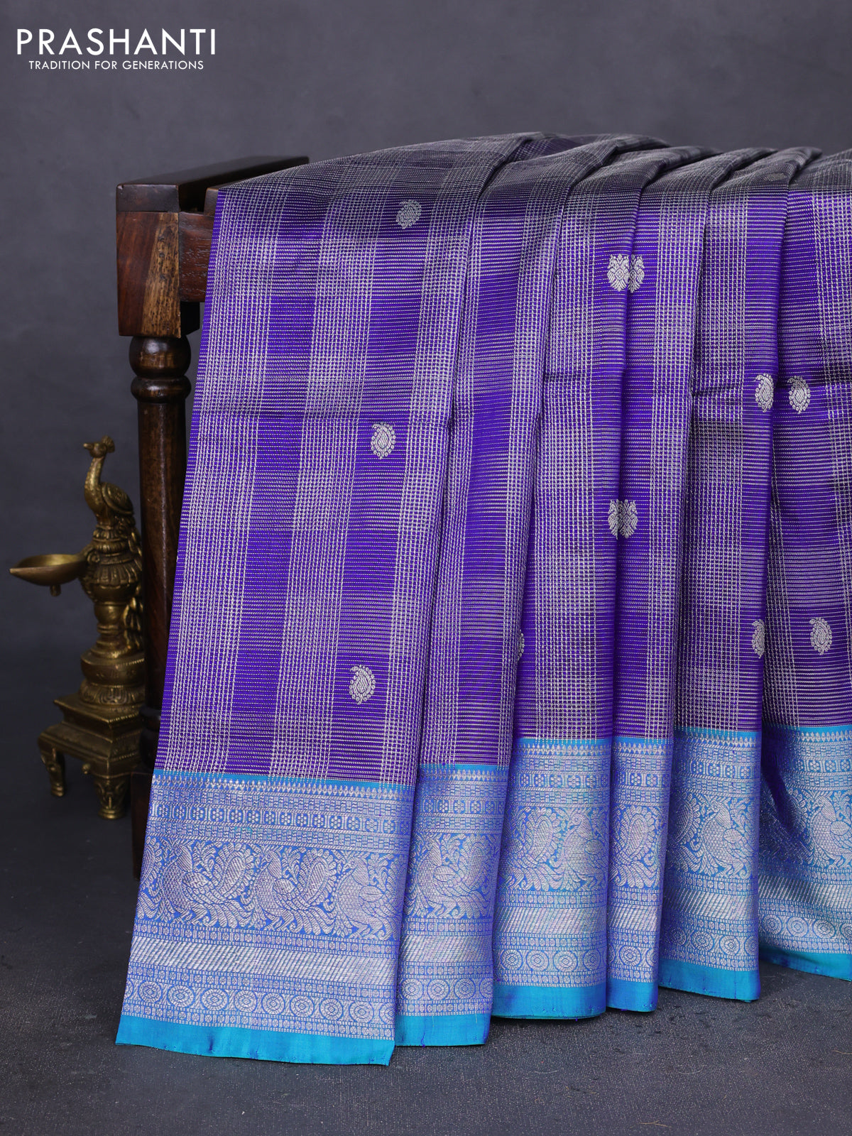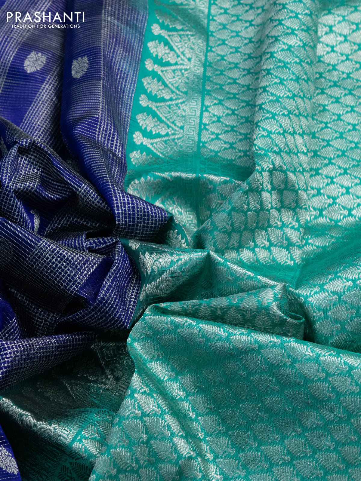 Venkatagiri silk saree blue and dual shade of teal green with allover silver zari woven brocade weaves and rich annam zari woven border