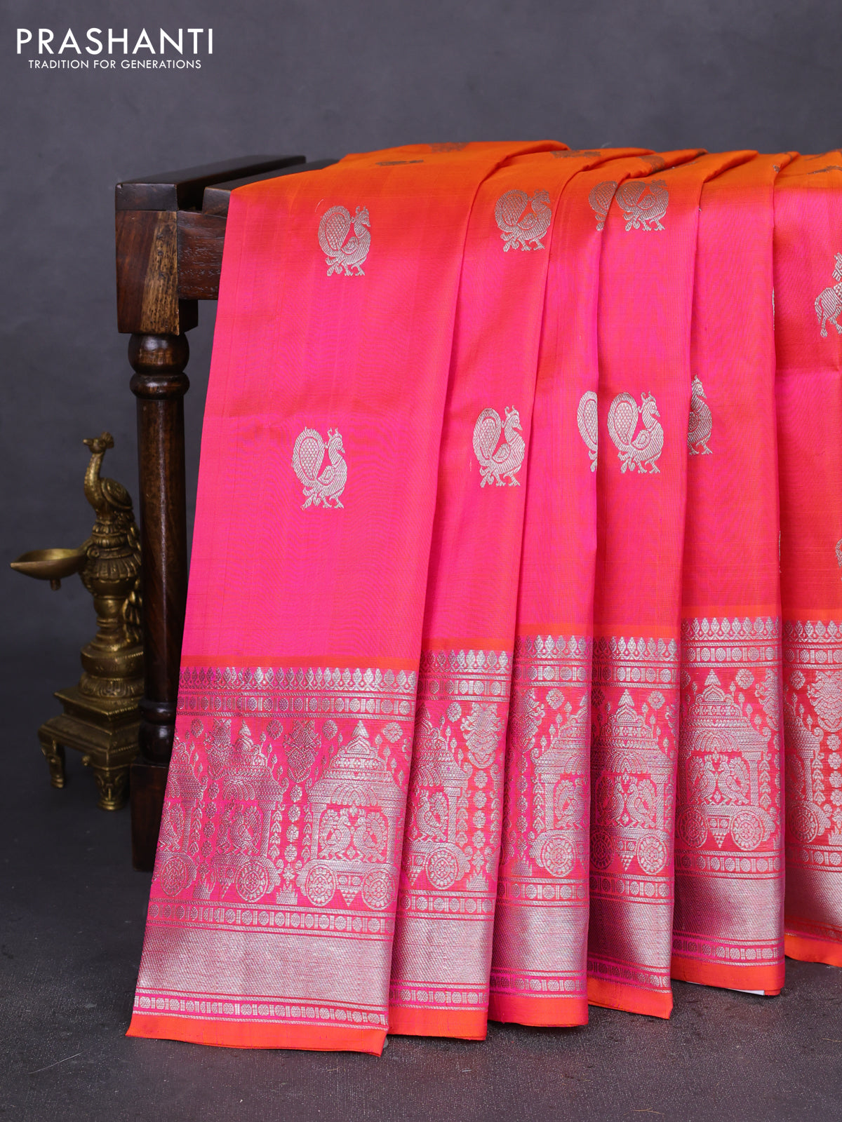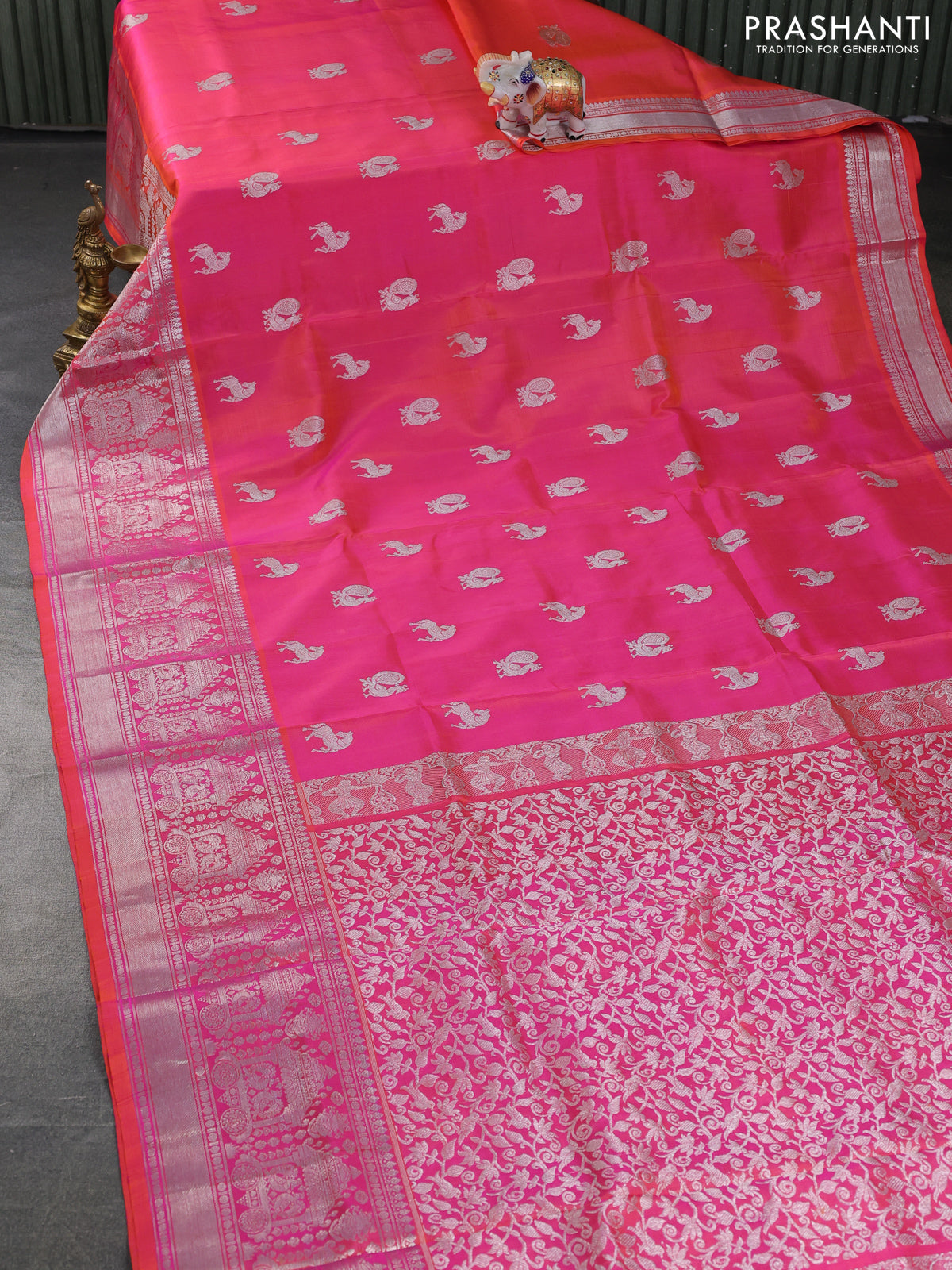 Venkatagiri silk saree dual shade of pinkish yellow with silver zari woven buttas and long silver zari woven border